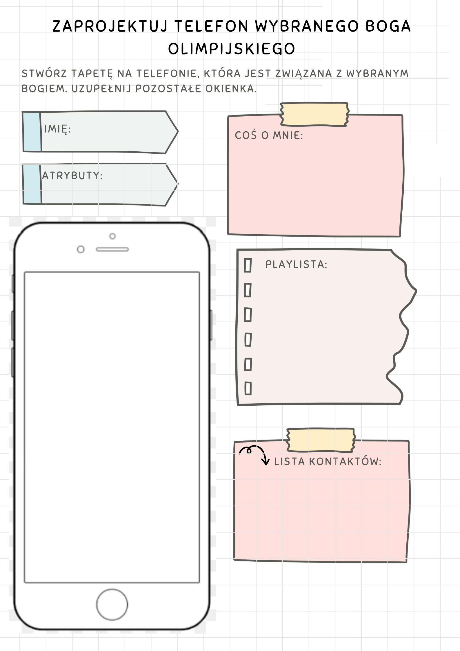 Karta pracy polegąjąca na zaprojektowaniu telefonu wybranego boga olimpijskiego - stworzenie tapety, którą mógłby mieć dany bóg oraz jego playlisty muzycznej. Na karcie znajdują się również pola do uzupełnienia informacjami o bogu: imię, atrubuty, lista kontaktów oraz pole "coś o mnie" gdzie należy wpisać informacje, które wiemy o danym bogu - z jego perspektywy. Pozwoli nam to wykorzystać kartę na różne sposoby, np. "Bóg olimpijski XYZ gubił telefon. Zaprojektuj jego telefon."