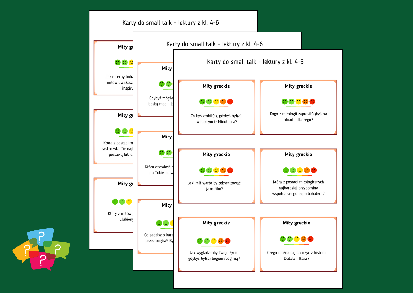 18 pytań typu „Karty small talk” do mitów greckich. Takie pytania mają charakter swobodny, zachęcają do refleksji, rozmowy i dzielenia się opinią, a nie tylko sprawdzają wiedzę. Mogą być wykorzystywane na lekcjach jako forma integracji z lekturą lub podczas luźniejszych rozmów literackich. Dzięki nim można ćwiczyć wypowiedź argumentacyjną. Zasady: uczeń losuje kartę i odpowiada na pytanie (lub wszyscy uczniowie odpowiadają na to samo pytanie).