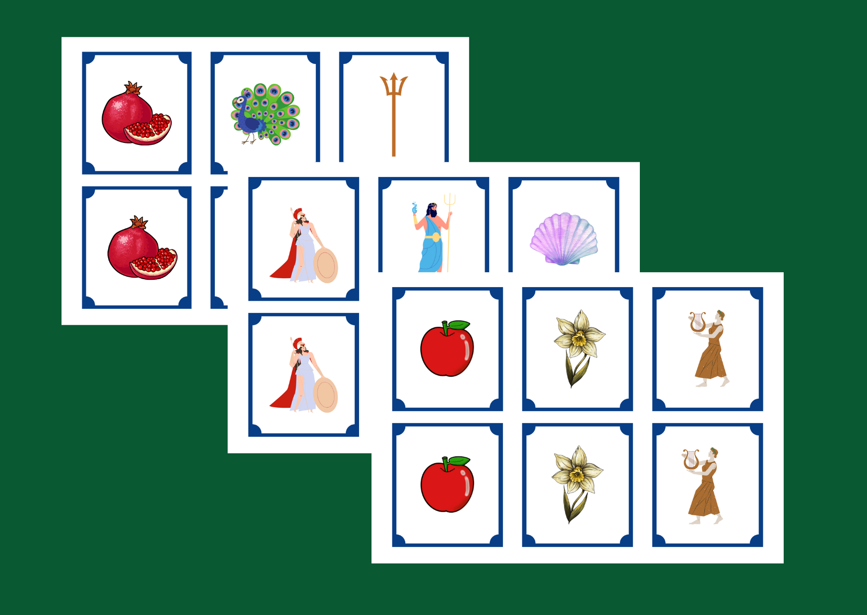 Gra memory uczy dzieci skupienia i koncentracji. Proponuję memory z ilustracjami dotyczącymi mitów greckich, 5 stron, na każdej po 6 ikonek. Po wycięciu materiał można zalaminować, aby dłużej służył.
