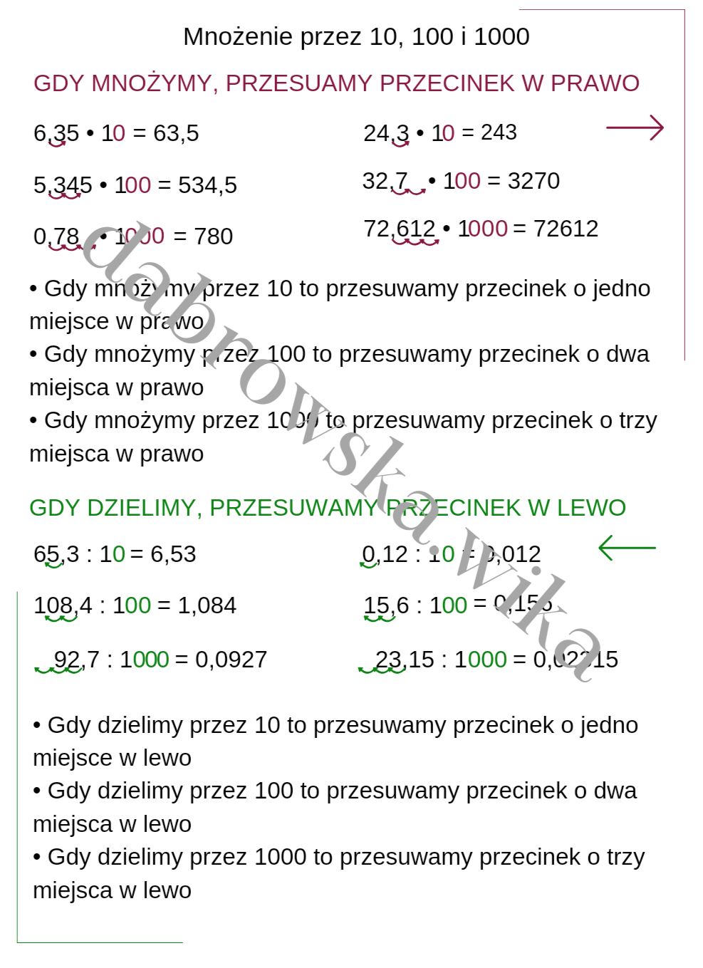Materiał zawiera notatkę zawierającą zasady jak mnożyć i dzielić przez 10, 100 i 1000.