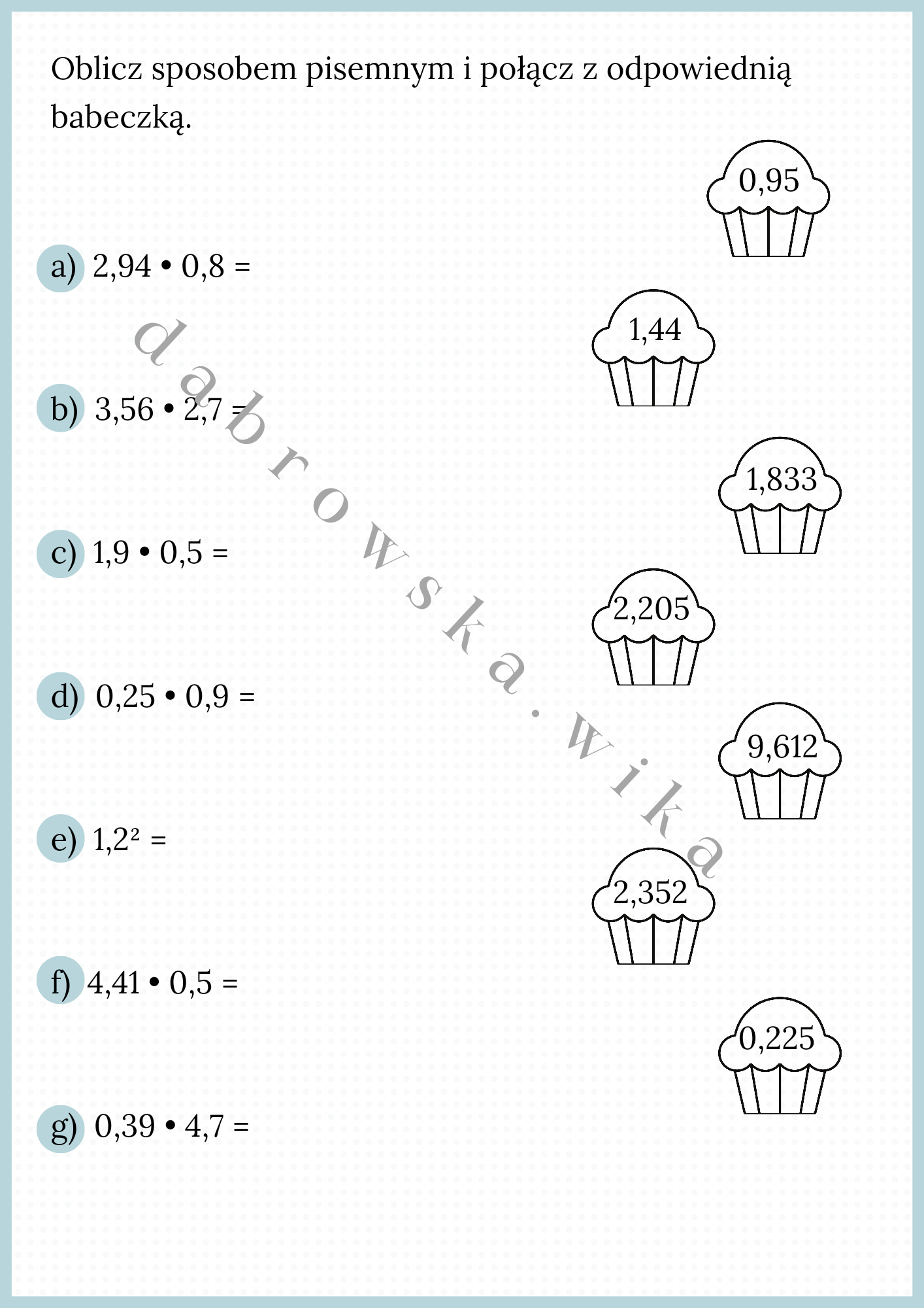 Zadaniem ucznia jest rozwiązanie przykładów i odnalezienie odpowiedniego wyniku na babeczce.