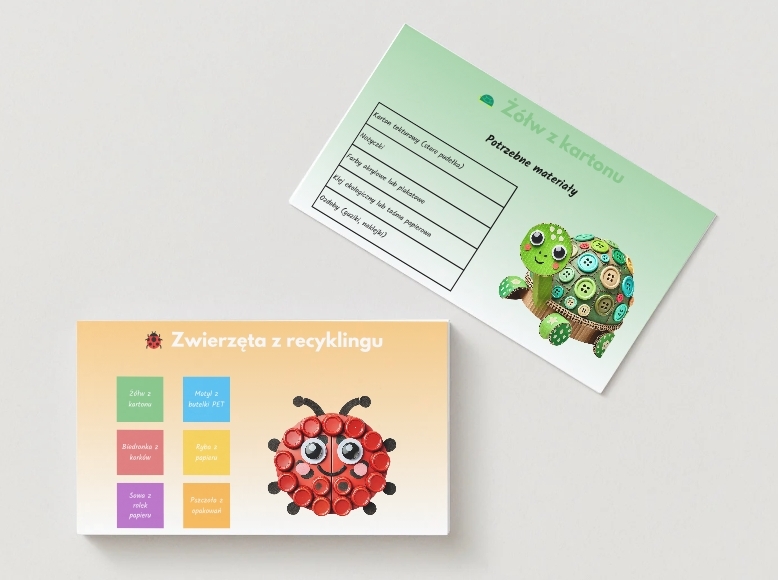 Każdy model to szczegółowa, obrazkowa instrukcja „krok po kroku”, dostosowana do potrzeb dzieci i uczniów. Wszystkie projekty powstają z ekologicznych, łatwo dostępnych materiałów: kartonu, butelek PET, rolek papierowych, korków czy nakrętek plastikowych. 🌱🧻🧴