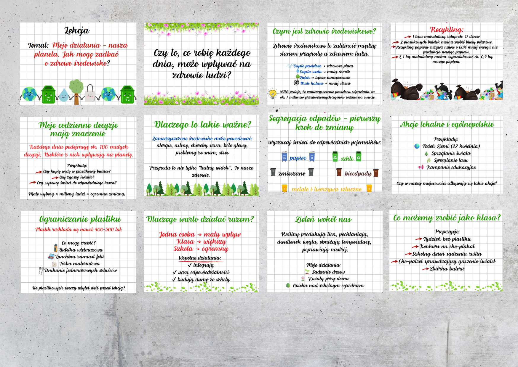 Moje działania – nasza planeta. Jak mogę zadbać o zdrowe środowisko? / Prezentacja/ Edukacja zdrowotna 12 stron PDF