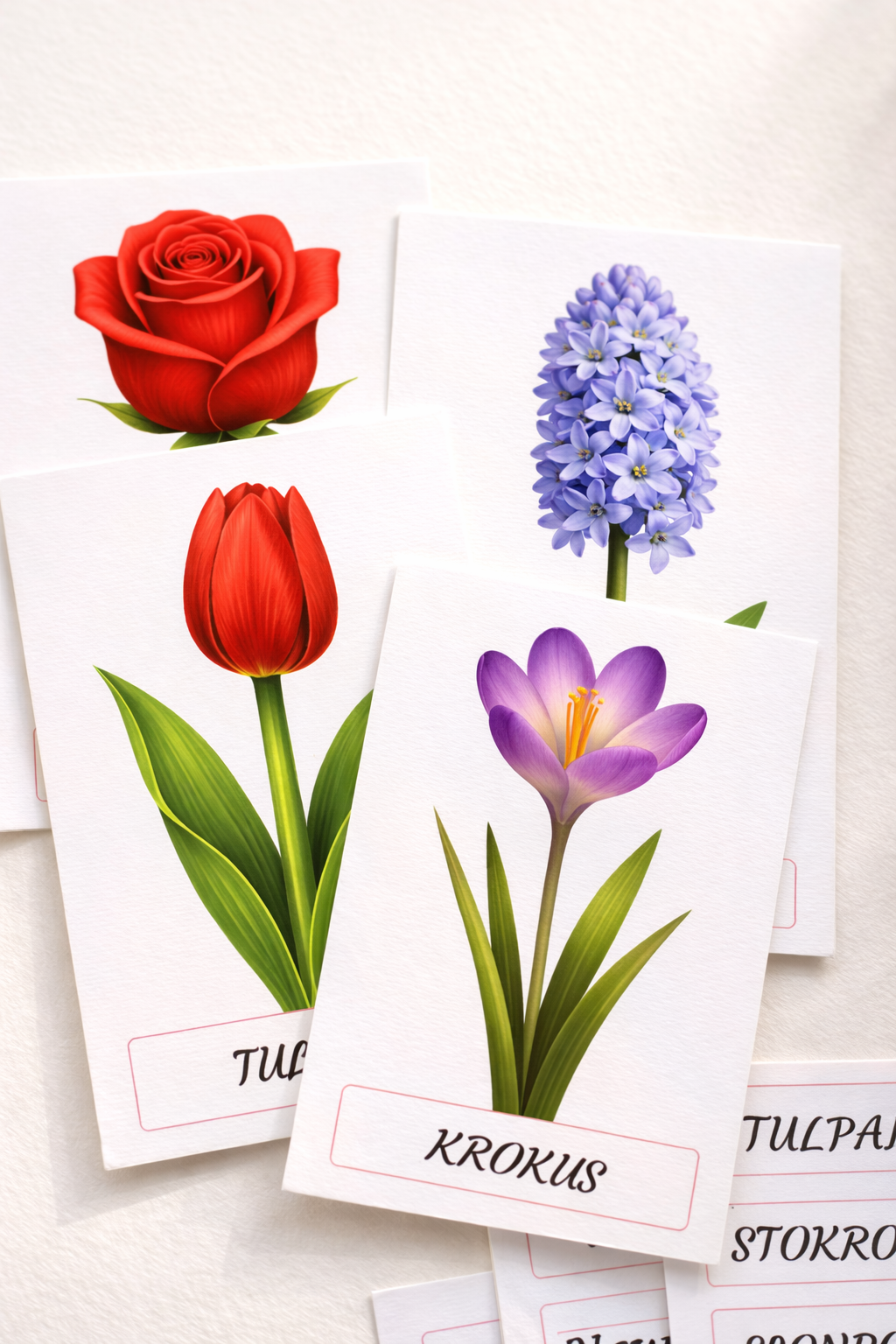 „Moje pierwsze kwiaty” to starannie przygotowany zestaw kart edukacyjnych PDF do druku, dzięki któremu dziecko poznaje najpopularniejsze kwiaty w przyjazny, atrakcyjny i angażujący sposób.