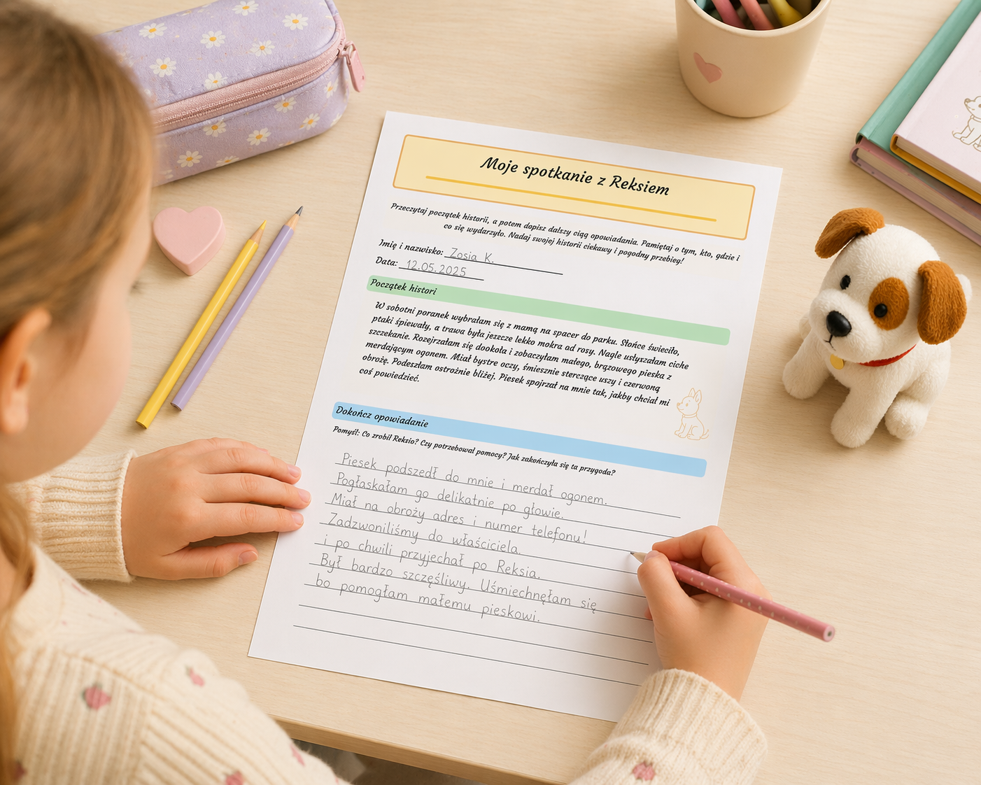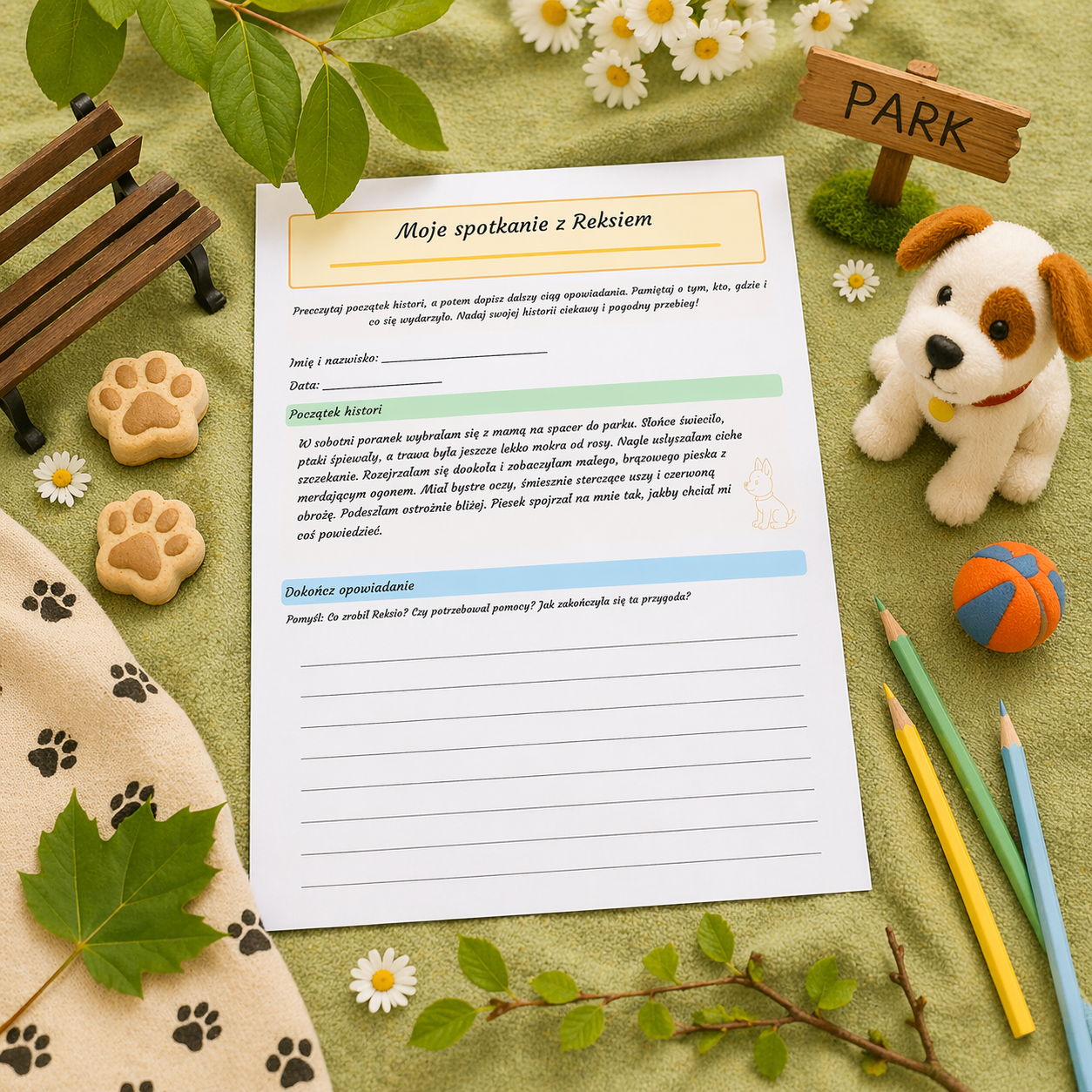 To materiał, w którym ja prowadzę ucznia krok po kroku – najpierw proponuję początek historii o spacerze w parku 🌳☀️ i spotkaniu z uroczym pieskiem, a następnie zostawiam przestrzeń na samodzielne dokończenie opowiadania. Dbam o to, aby dziecko zwróciło uwagę na ważne elementy: bohaterów, miejsce i wydarzenia.