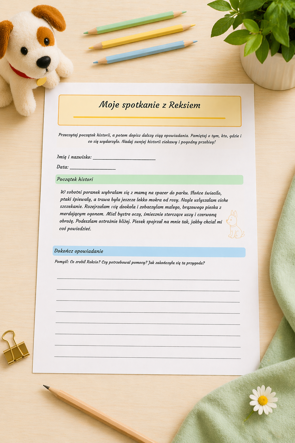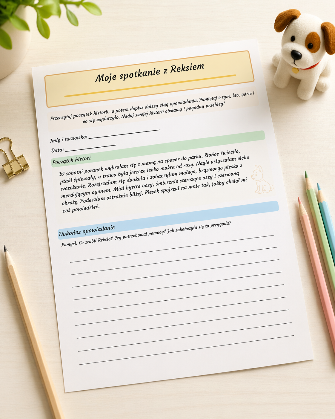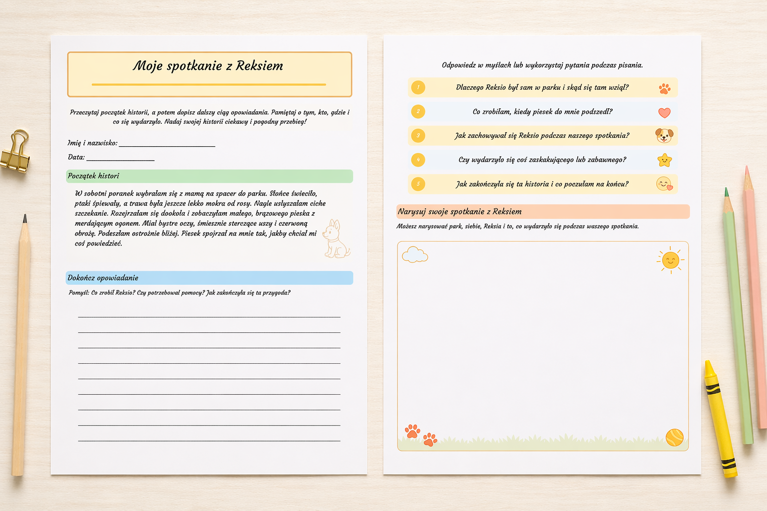 Z ogromną radością przygotowałam kartę pracy „Moje spotkanie z Reksiem” 🐶✨, która rozwija kreatywność i zachęca dzieci do tworzenia własnych opowiadań.