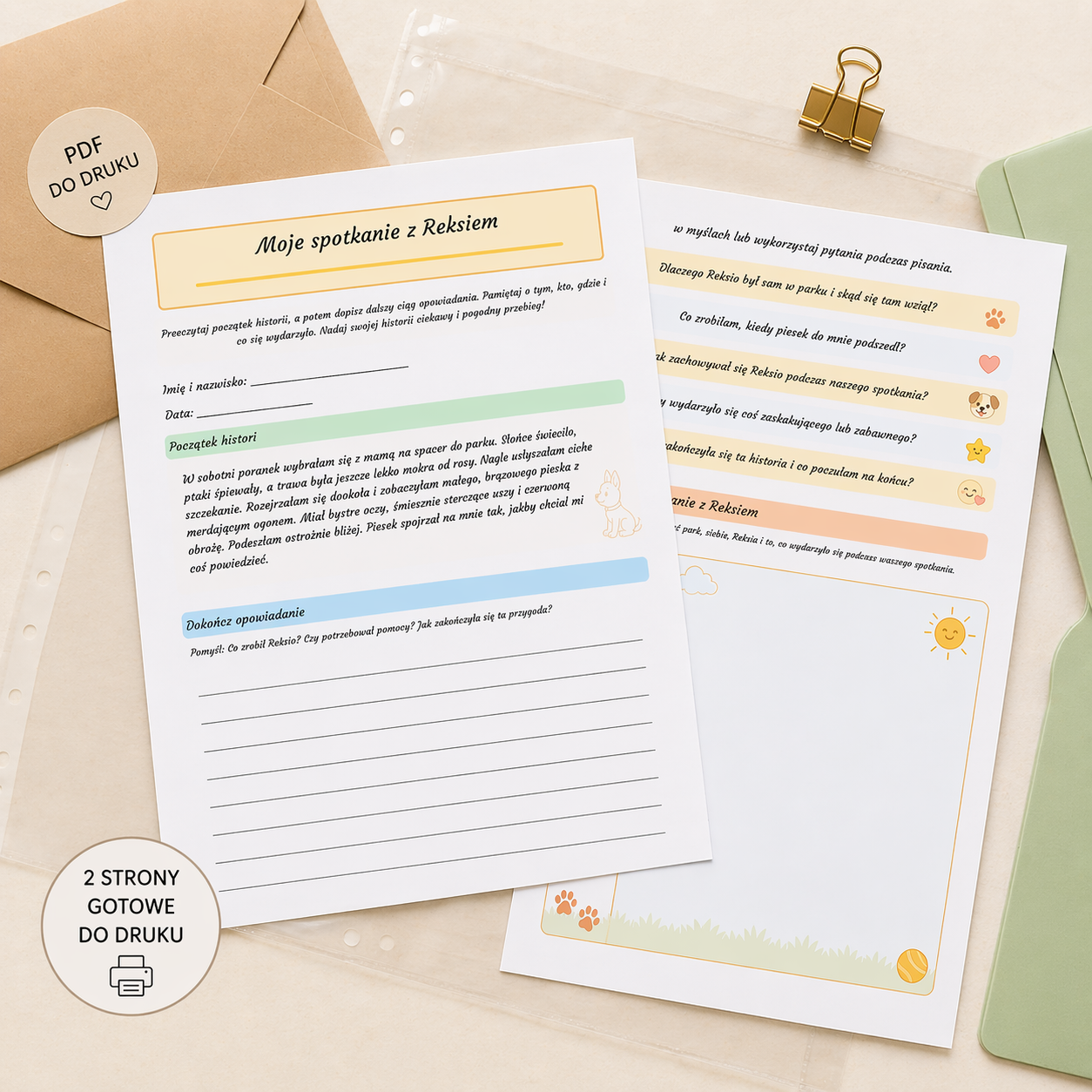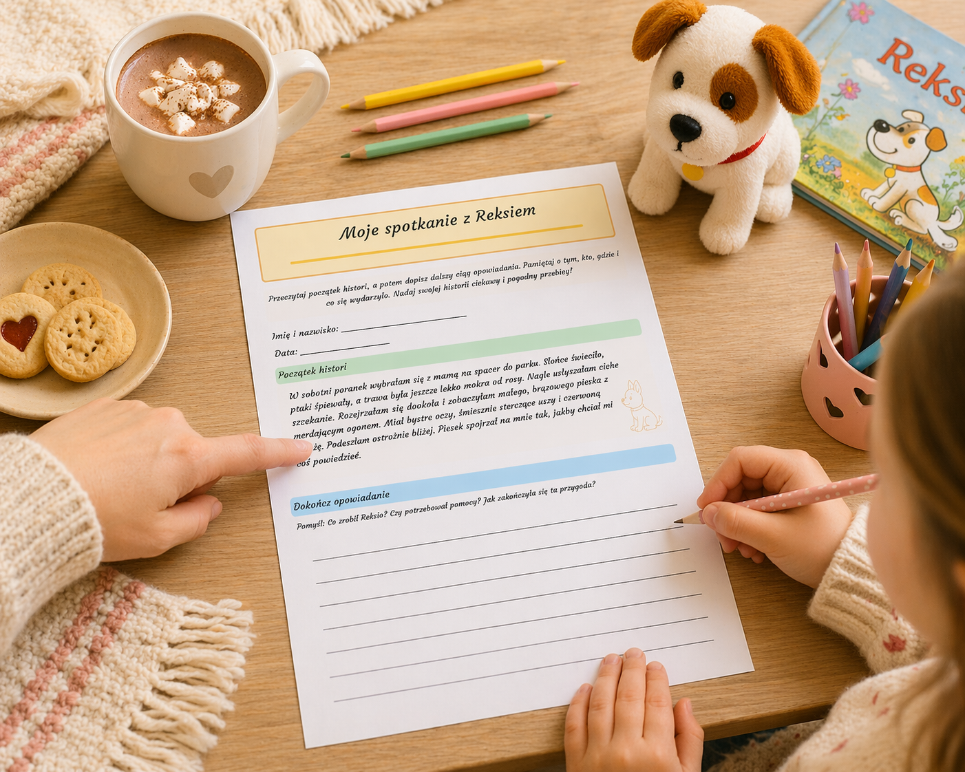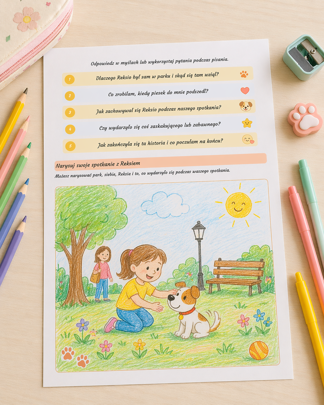 Z ogromną radością przygotowałam kartę pracy „Moje spotkanie z Reksiem” 🐶✨, która rozwija kreatywność i zachęca dzieci do tworzenia własnych opowiadań.