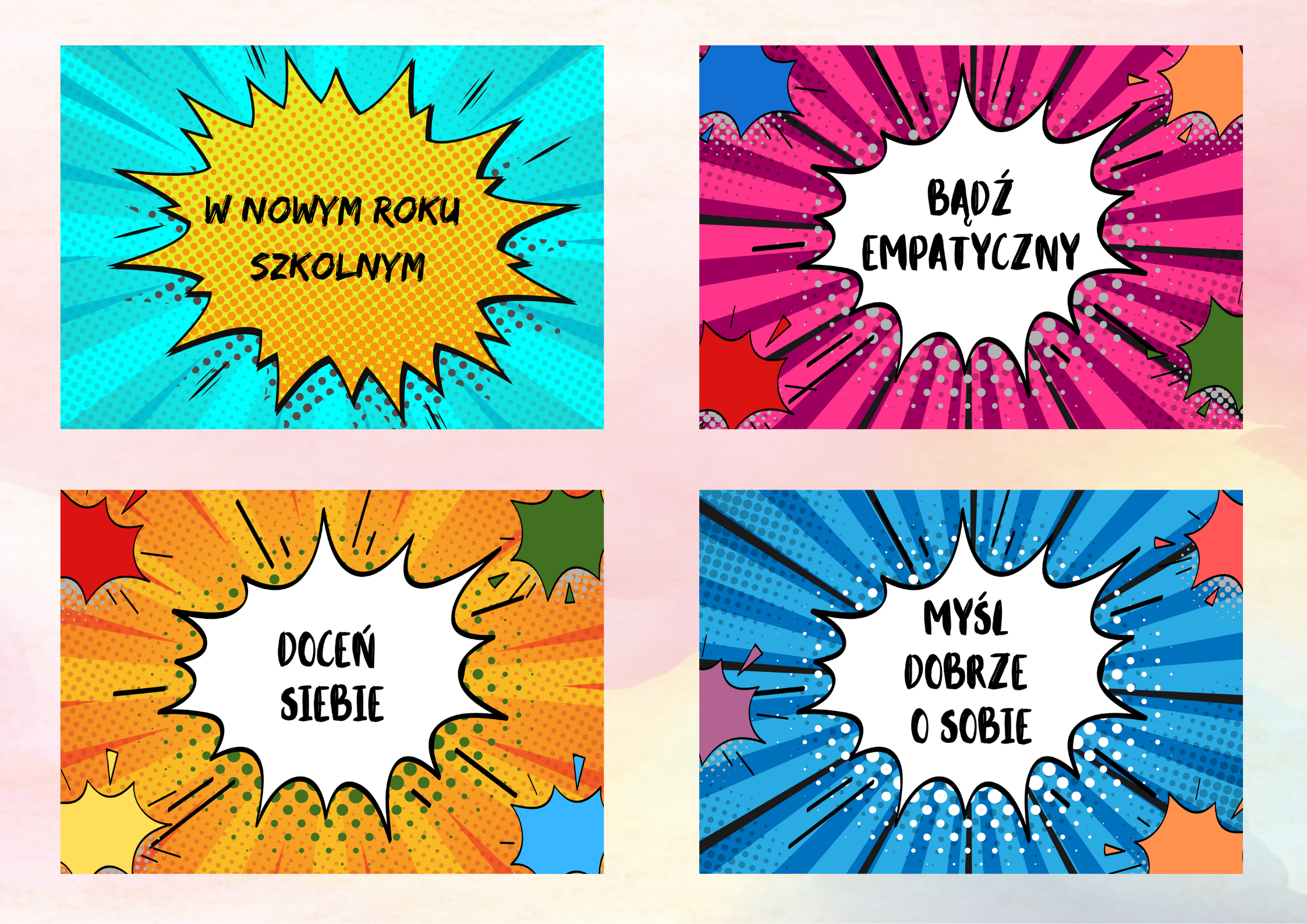 Materiał na gazetkę szkolną. Składa się z 15 plansz zawierających motywujące hasła na nowy rok szkolny.