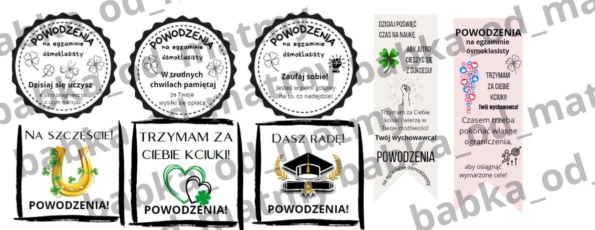 Zestaw zawiera zbiór różnych zachętek i motywatorów do wydrukowania i rozdania uczniom tuż przed egzaminem ósmoklasisty.