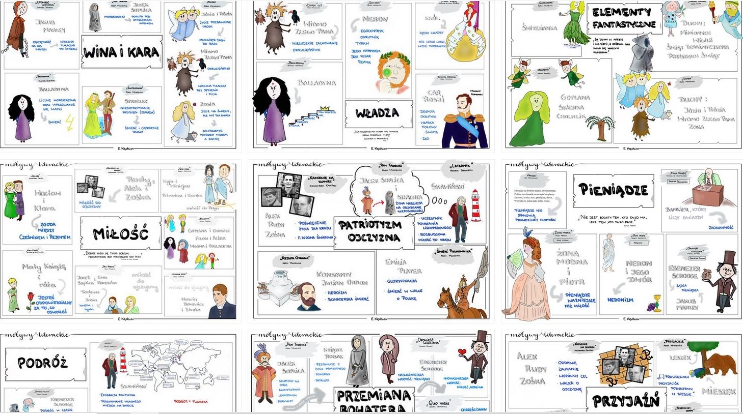 W zestawie 10 plansz "Motywy literackie " do wypełniania przez uczniów. Dodatkowo 10 arkuszy, które zostały wykorzystane podczas nagrywania filmów dotyczących motywów (są wypełnione, ale bardzo schematycznie). Materiał idealny do powtórek przed egzaminem ósmoklasisty. W zestawie plansze do motywów: - miłość, - pieniądze, - władza, - wina i kara, - patriotyzm, - podróż, - sens życia, - elementy fantastyczne, - przyjaźń, - przemiana bohatera.