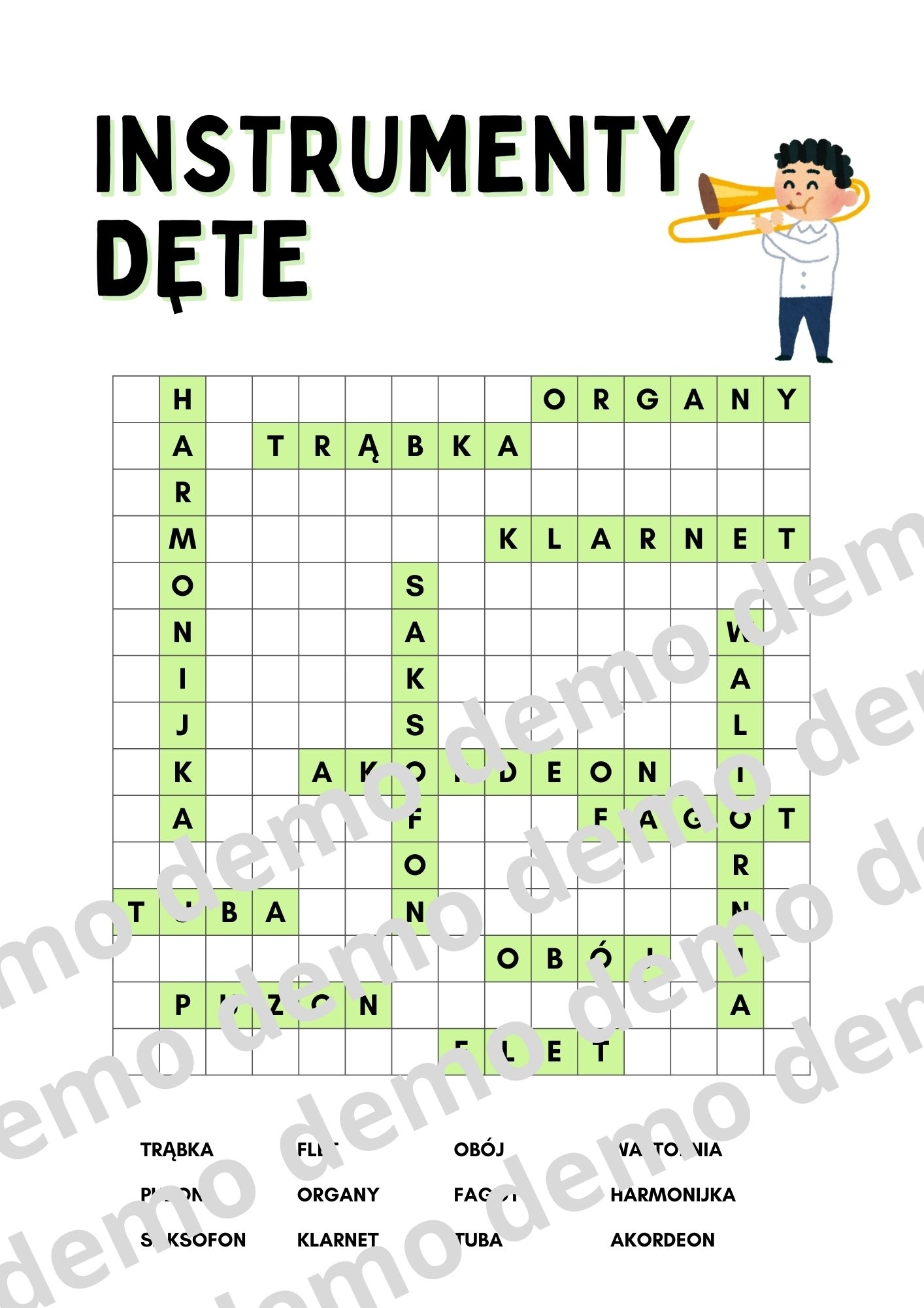 trąbka, puzon, saksofon, flet, organy, klarnet, obój, fagot, tuba, waltornia, harmonijka, akordeon