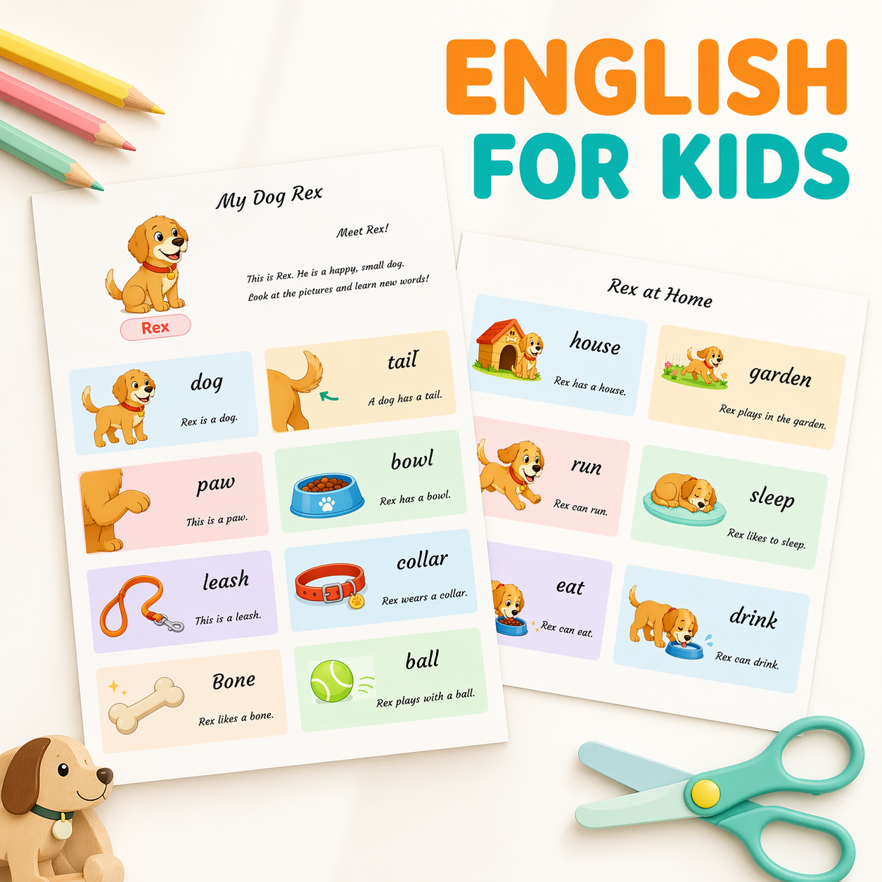 Urocza, starannie zaprojektowana mini-publikacja edukacyjna, która wprowadza najmłodszych w świat języka angielskiego poprzez historię sympatycznego pieska Rexa. Kolorowe ilustracje i proste, naturalne zdania budują słownictwo w sposób intuicyjny i przyjazny dziecku — od części ciała i przedmiotów po codzienne czynności. Całość tworzy spójną, angażującą opowieść, która uczy przez zabawę i zachęca do odkrywania języka z radością.