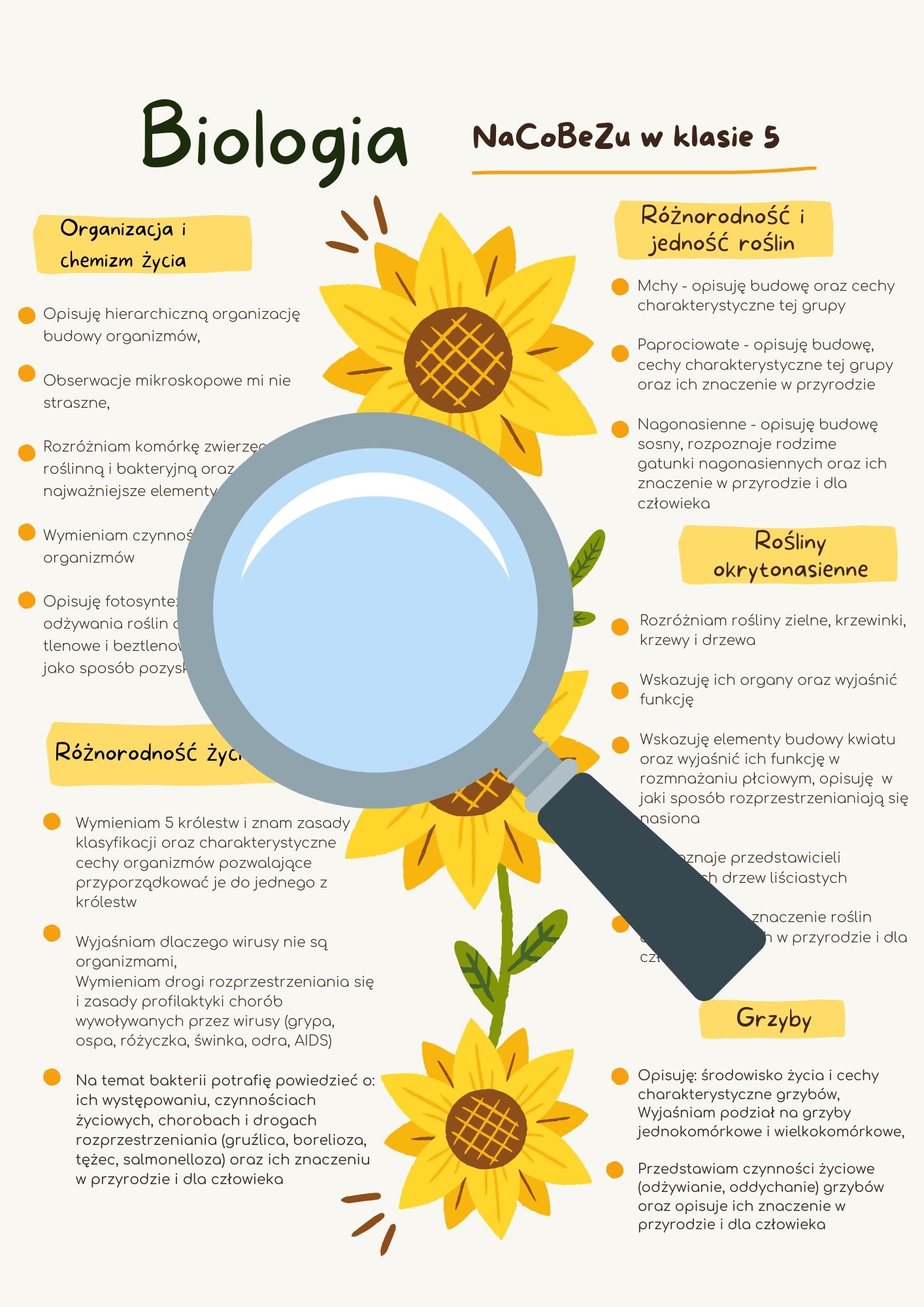 Materiał przedstawia drogę jaką przechodzi uczeń na biologii w klasie 5 (zakres materiału i wymagań). Doskonały na wklejkę do zeszytu podczas lekcji organizacyjnej.