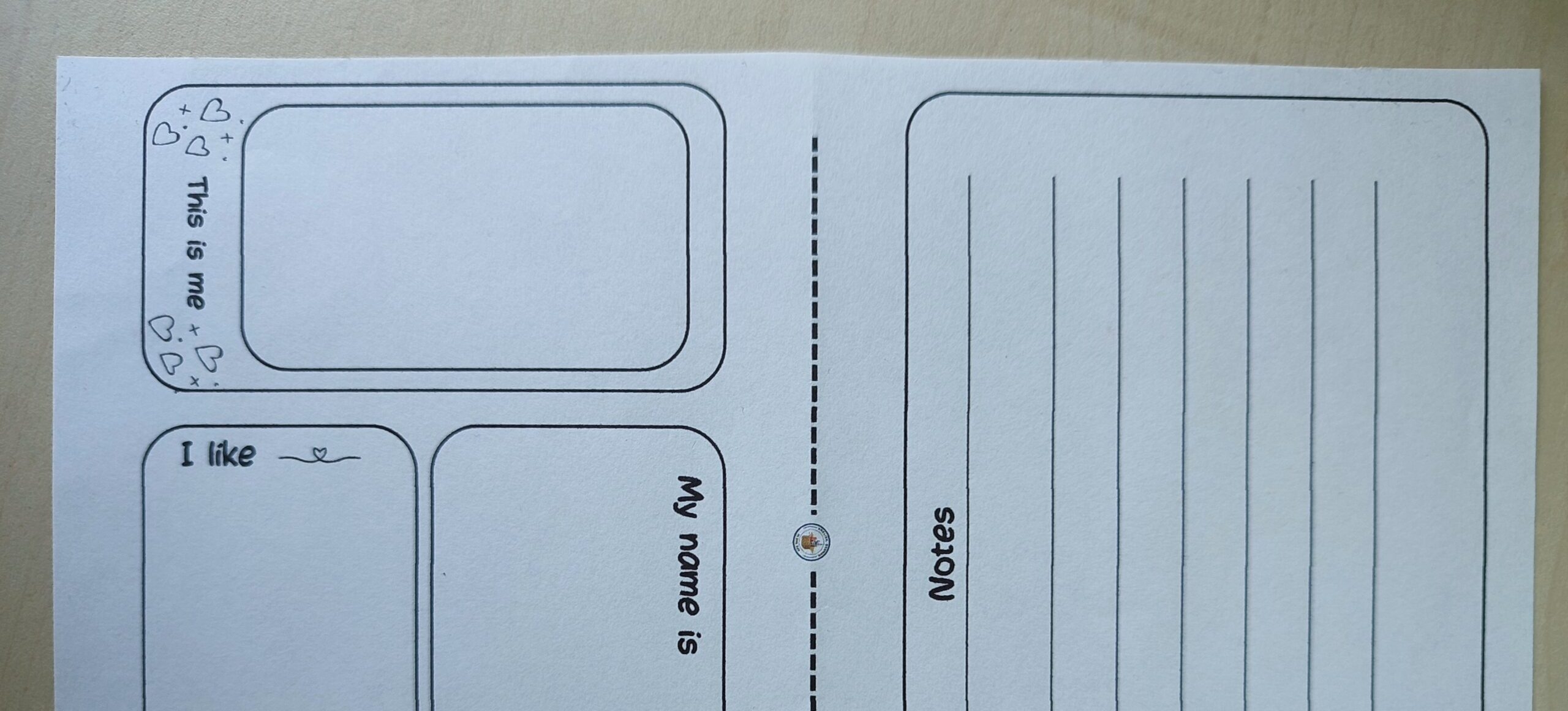Wizytówki dla nowych uczniów. Kursanci wpisują na jednej stronie swoje imię oraz swoje hobby i zainteresowania. Po drugiej stronie mają miejsce na swoje notatki, gdzie mogą zamieścić najważniejsze wiadomości z lekcji.