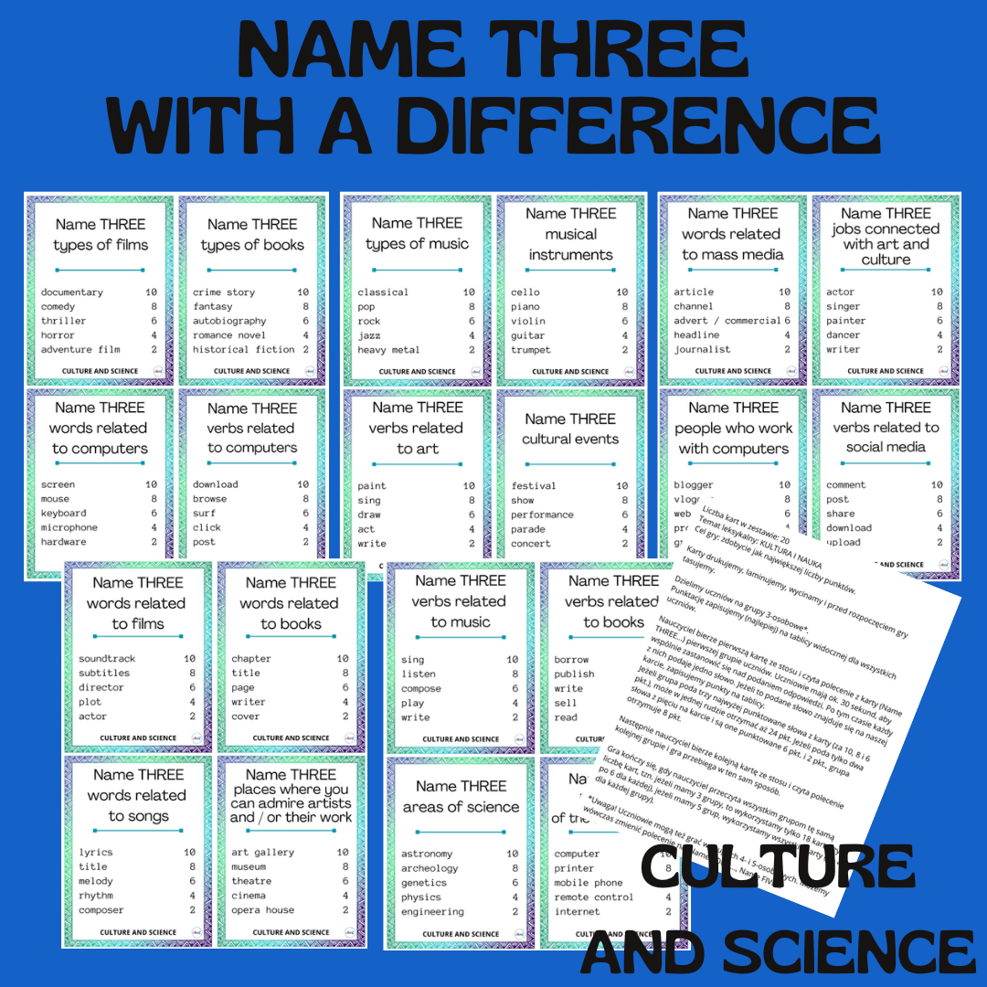 Cel gry: zdobycie jak największej liczby punktów oraz (przede wszystkim) powtórzenie i utrwalenie słownictwa z zakresu leksykalnego KULTURA I NAUKA