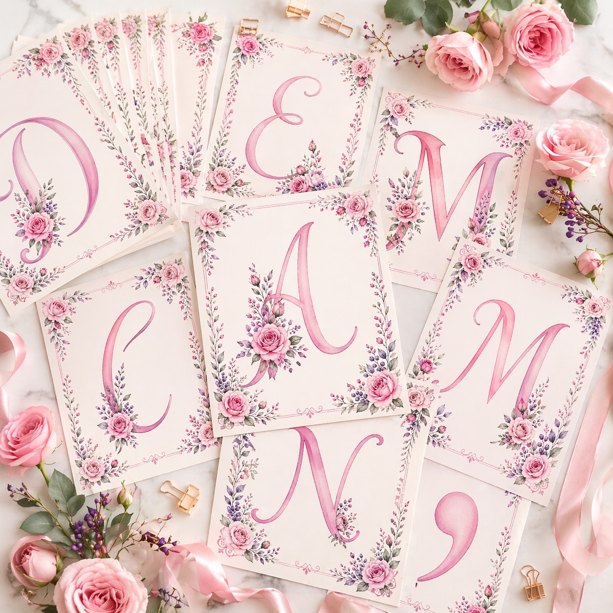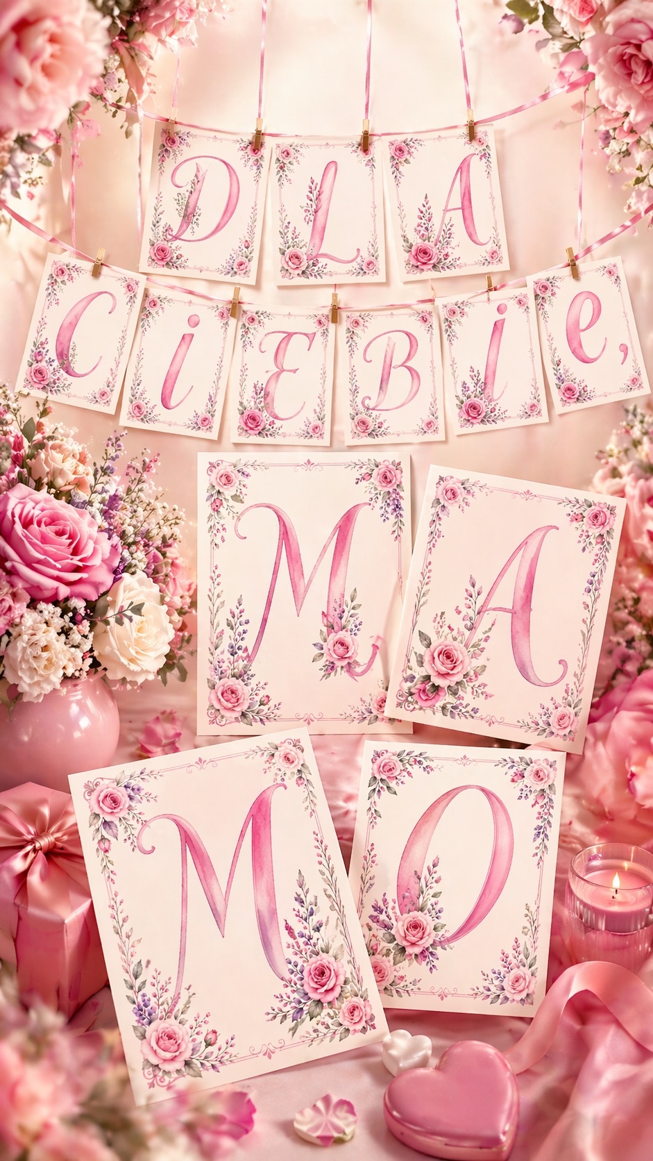 Dekoracyjny napis „Dla Ciebie, Mamo” został przygotowany w subtelnej, pastelowej i eleganckiej stylistyce. Każda litera znajduje się na osobnej karcie A4, dzięki czemu całość pięknie prezentuje się jako ozdoba sali, gazetki szkolnej lub scenografii na akademię. Motyw przewodni stanowią delikatne róże, drobne jagodowe akcenty oraz ozdobne ramki w odcieniach pudrowego różu, lila i jasnej zieleni. Kompozycja jest lekka, romantyczna i bardzo estetyczna, idealna na uroczystości z okazji Dnia Matki. Całość tworzy ciepłą, uroczą dekorację, która podkreśla wyjątkowy charakter tego święta. 💗🌹✨