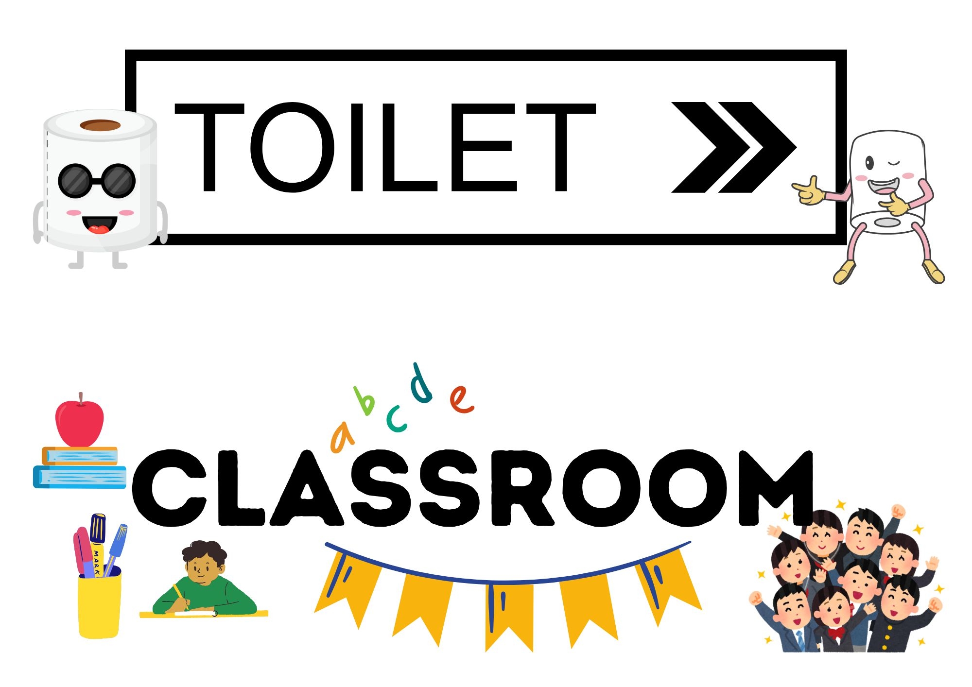 Zestaw napisów na pomieszczenia w szkole w języku angielskim - classroom, toilet, playground, gym, library, corridor, computer room, canteen, cloakroom, common room, science lab, staff room. Polecam zalaminować napisy. Napisy pozwalają szybciej zapamiętać słownictwo poprzez codzienny kontakt ze słownictwem, tzw. forcing.