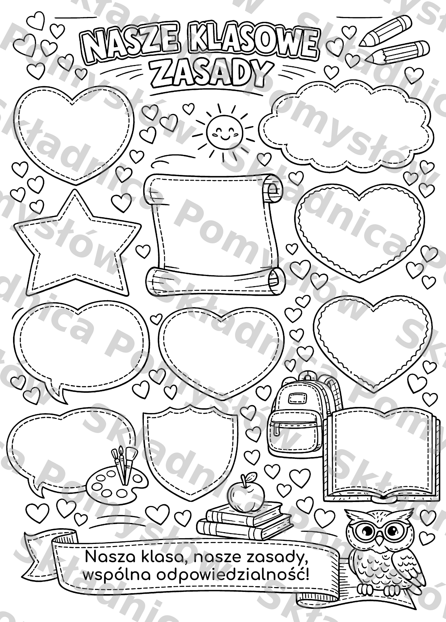 Pakiet zawiera 1 stronę A4 z miniaturą plakatu oraz 9 stron A4 do złożenia dużego plakatu. Materiał świetnie sprawdzi się podczas zajęć integracyjnych, godzin wychowawczych, na początku roku szkolnego oraz przy ustalaniu zasad współpracy w zespole klasowym.