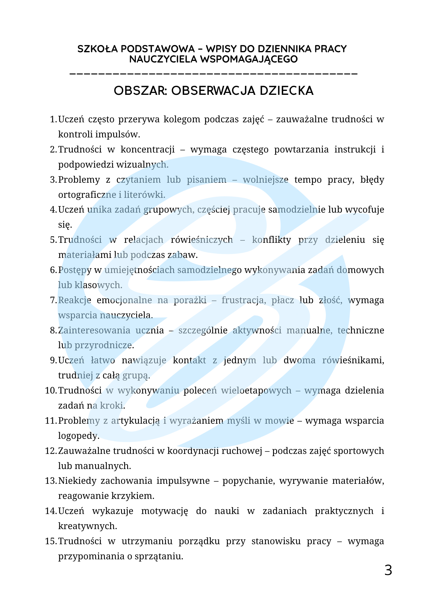 Znajdziesz tu dziesiątki gotowych wpisów do dziennika nauczyciela wspomagającego, opracowanych z myślą o realiach pracy w szkole podstawowej. Każdy przykład jest praktyczny, zwięzły i oddaje codzienność współorganizowania kształcenia.