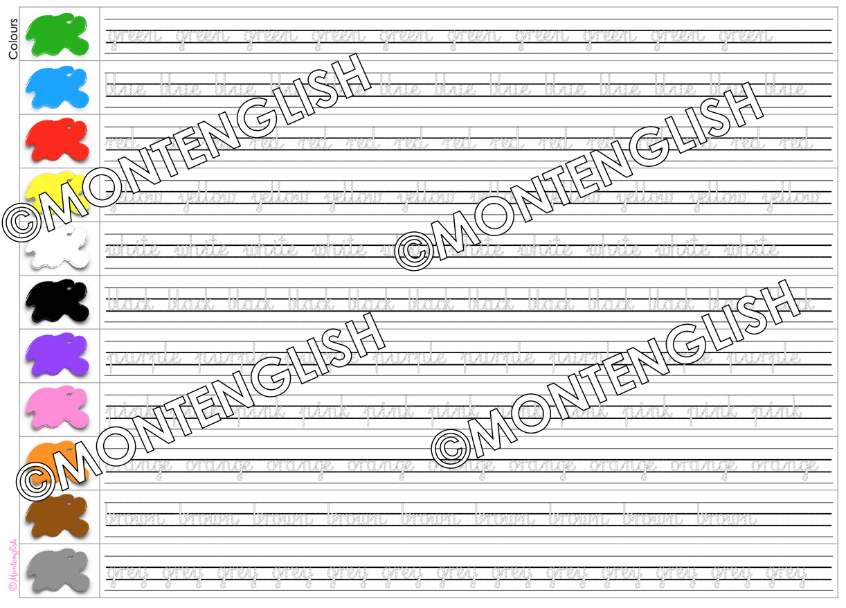 W zestawie znajdują się trzy karty. Na każdej jest ten sam zestaw słownictwa, ale trzy rożne warianty linii do pisania: