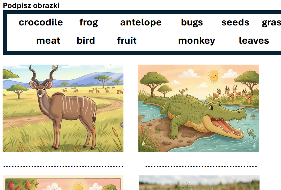 Zadania dodatkowe do podręcznika New English Adventure unit 7. Zadania skupiają się na słownictwieoraz tworzeniu zdań w czasie Present Simple.