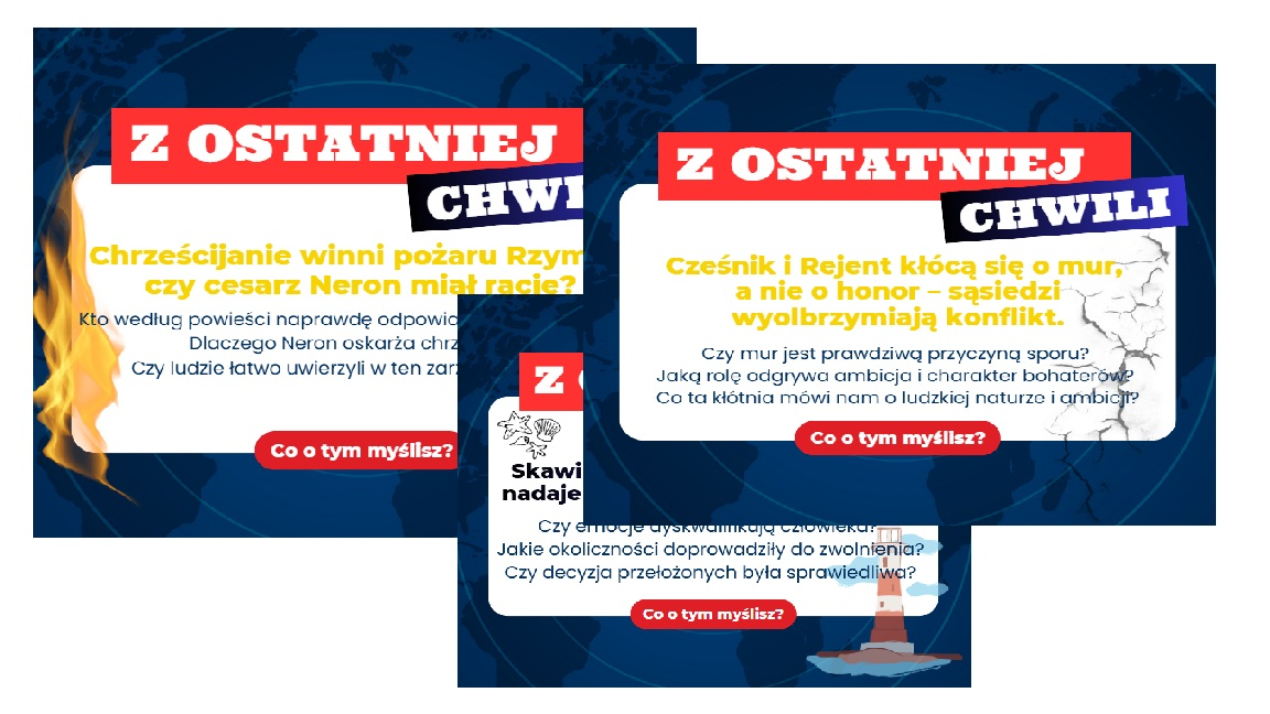 Zadania opierają się na celowo przekłamanych nagłówkach, które odnoszą się do wydarzeń, bohaterów i problematyki utworów literackich.