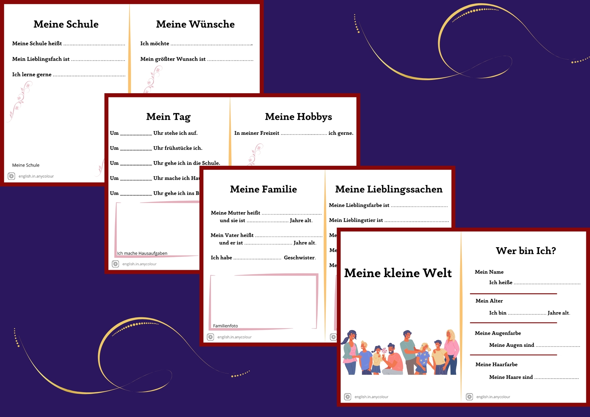 Język niemiecki. Mini książeczka/paszport do uzupełniania przez uczniów pt. "Ich und mein Alltag” (Ja i moja codzienność) przeznaczonej dla uczniów na poziomie A1. Książeczka skupi się na umiejętności przedstawiania się oraz opisania swojej codzienności.