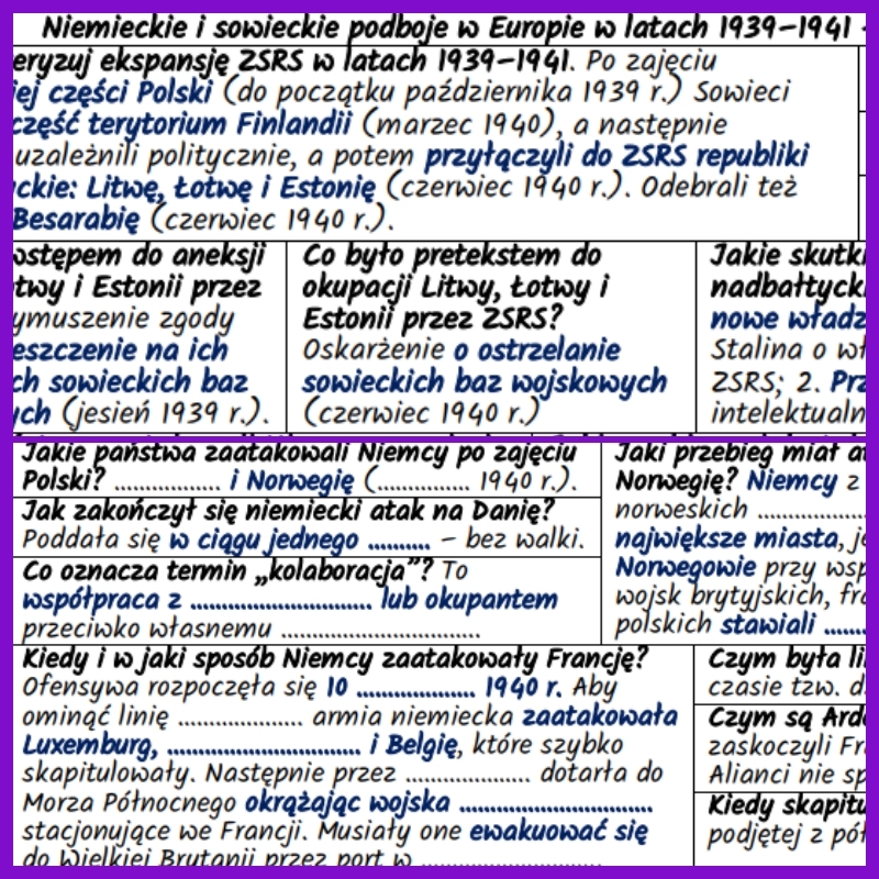 Notatki w formie pytań i odpowiedzi dotyczące ekspansji Niemiec i ZSRS mającej na celu podbój Europy, przygotowane dla klasy 8 według podstawy programowej nauczania historii w szkole podstawowej (Podstawa programowa – Historia – Szkoła podstawowa IV-VIII) oraz utrwalająca wiedzę karta pracy zawierająca luki w treści wymagające uzupełnienia ustnego lub pisemnego.