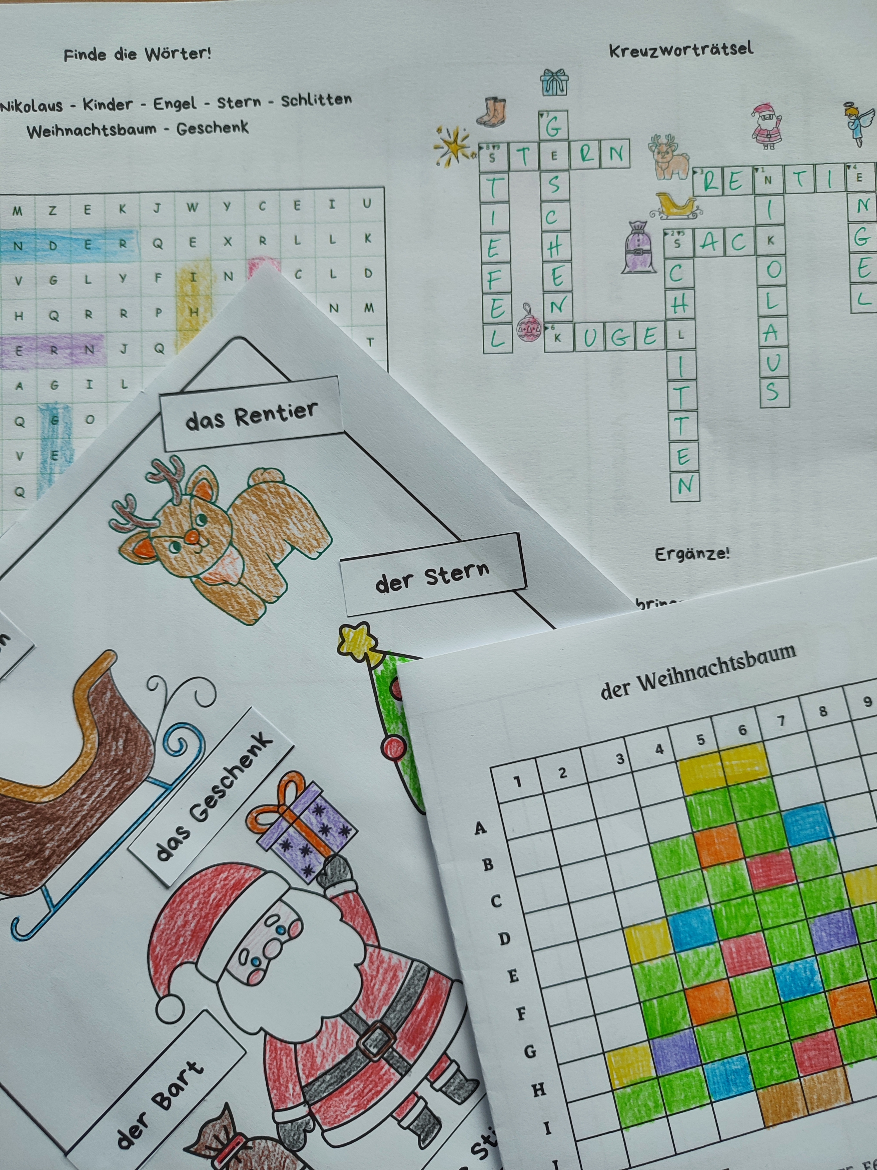 Materiały przeznaczone dla młodszych dzieci, dużo dobrej zabawy a przy okazji wprawadzenie i utrwalenie słówek związanych z mikołajkami plus tekst o zwyczajach mikołajkowych w Niemczech.