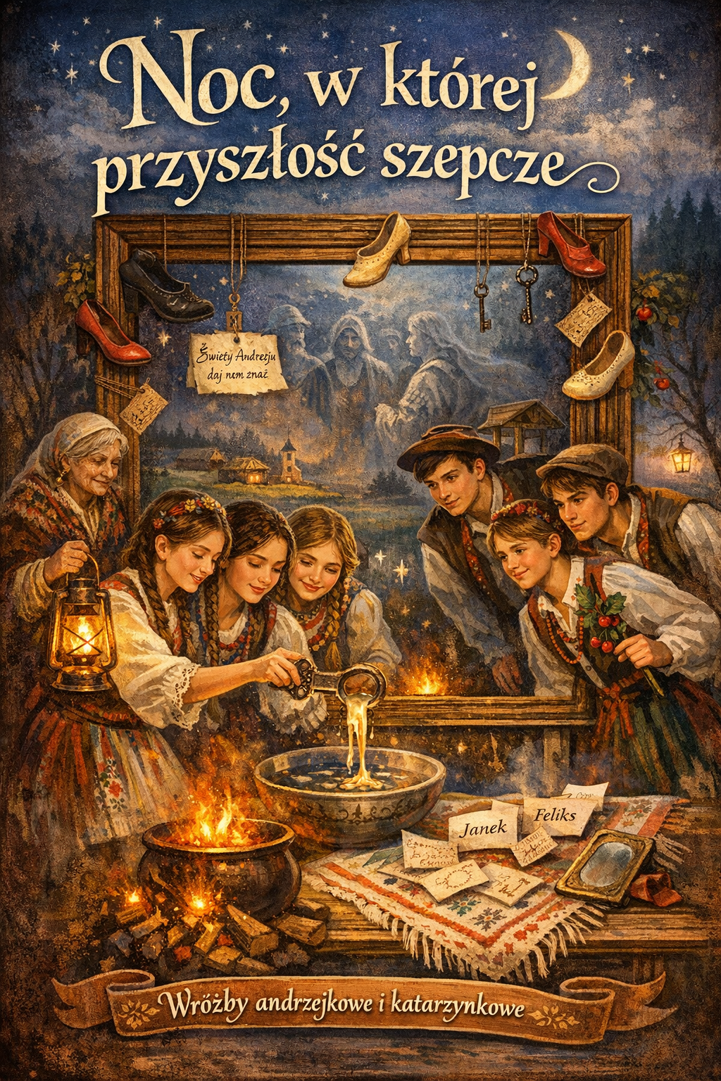 Akcja rozgrywa się podczas jednej, wyjątkowej nocy – nocy wróżb. Młode dziewczęta i chłopcy, prowadzeni przez doświadczoną Babunię – strażniczkę pamięci i ludowej mądrości – poznają dawne sposoby odczytywania losu: lanie wosku, wróżby senne, ogień ochronny, losowanie imion oraz zapomniane dziś katarzynkowe przepowiednie kawalerskie.