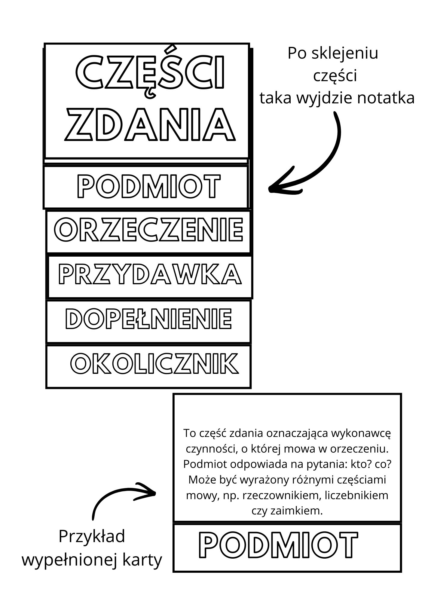 To praktyczny materiał dla nauczycieli, który zamienia zwykłą notatkę w aktywną pomoc dydaktyczną. Uczniowie tworzą ją samodzielnie, sklejając kolejne elementy – dzięki temu powstaje przejrzysta, składana harmonijkowa notatka przedstawiająca części zdania: