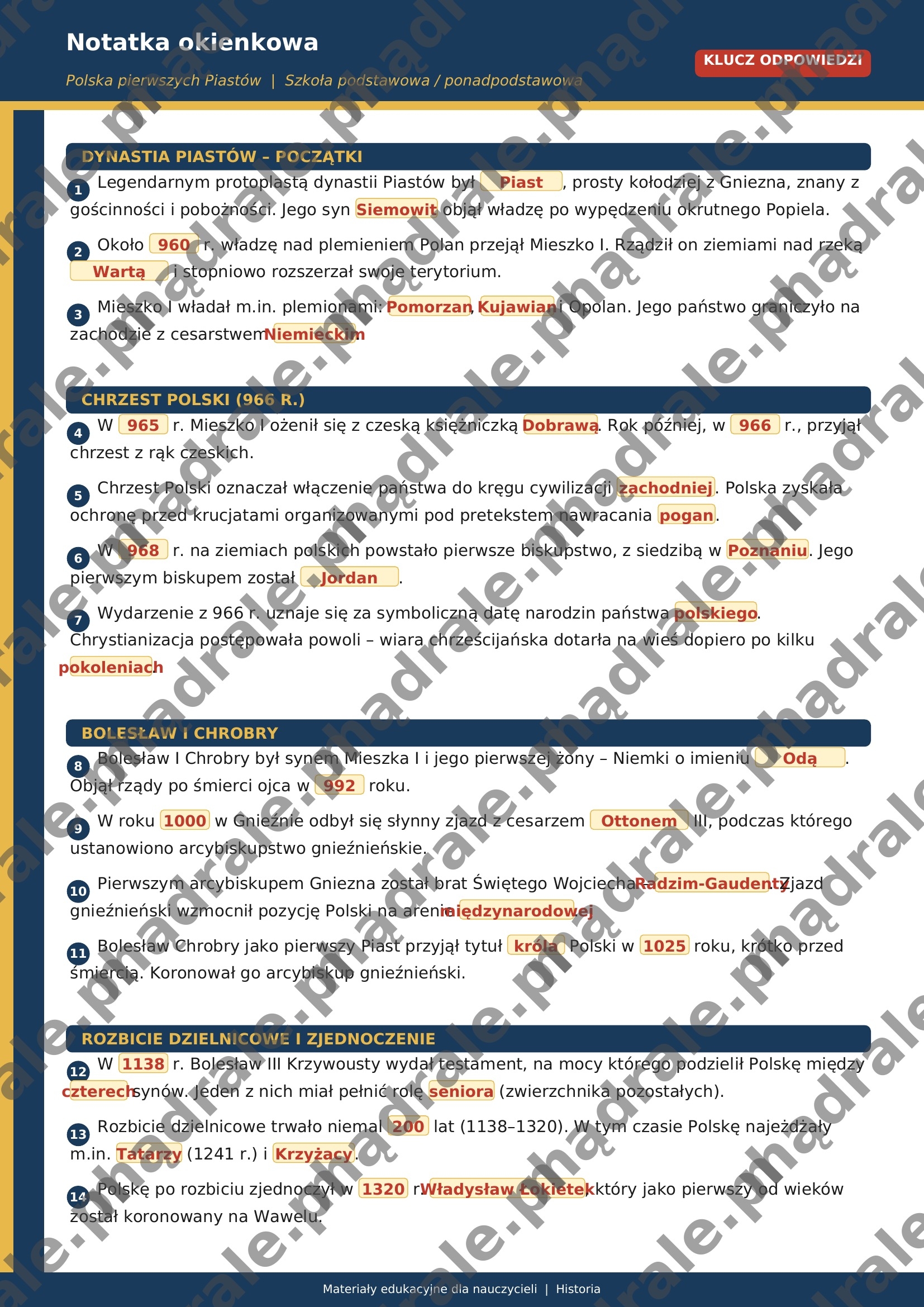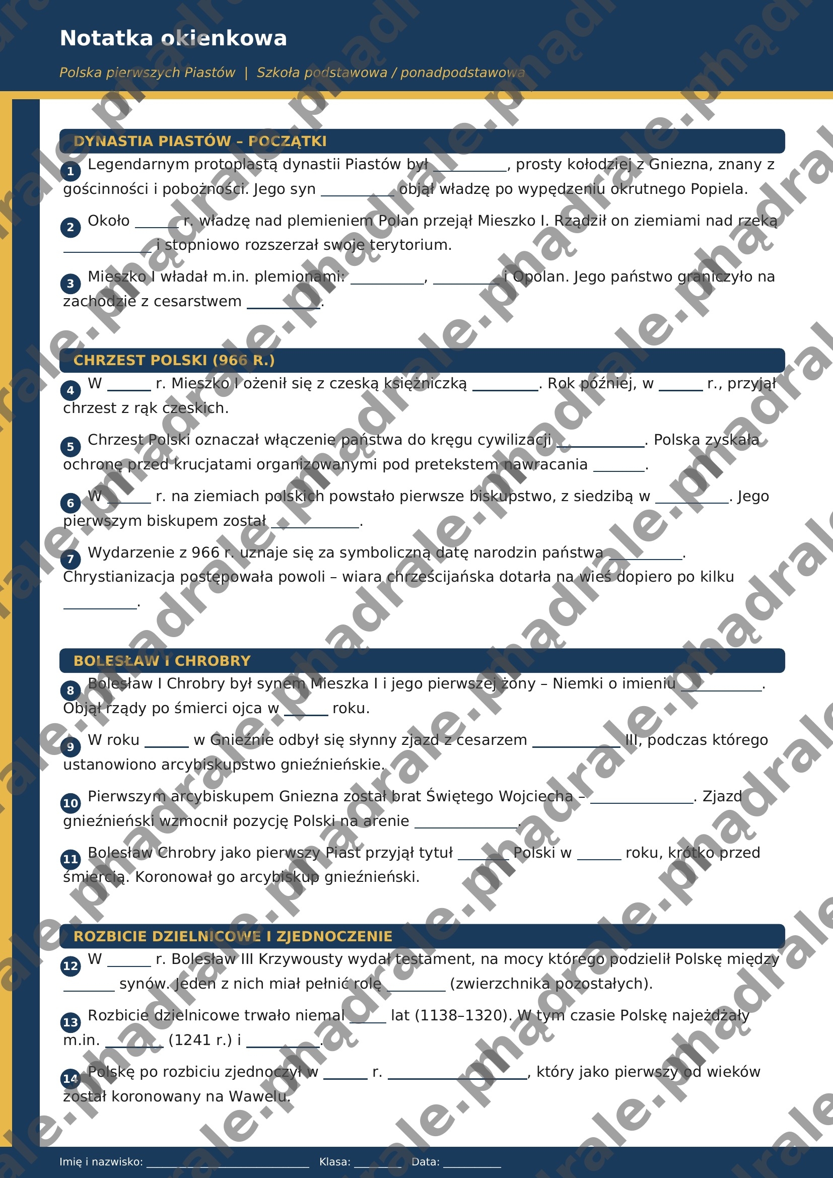 🧩 Notatkę okienkową dotyczącą Polski pierwszych Piastów, umożliwiającą uporządkowanie najważniejszych informacji w przejrzystej formie.