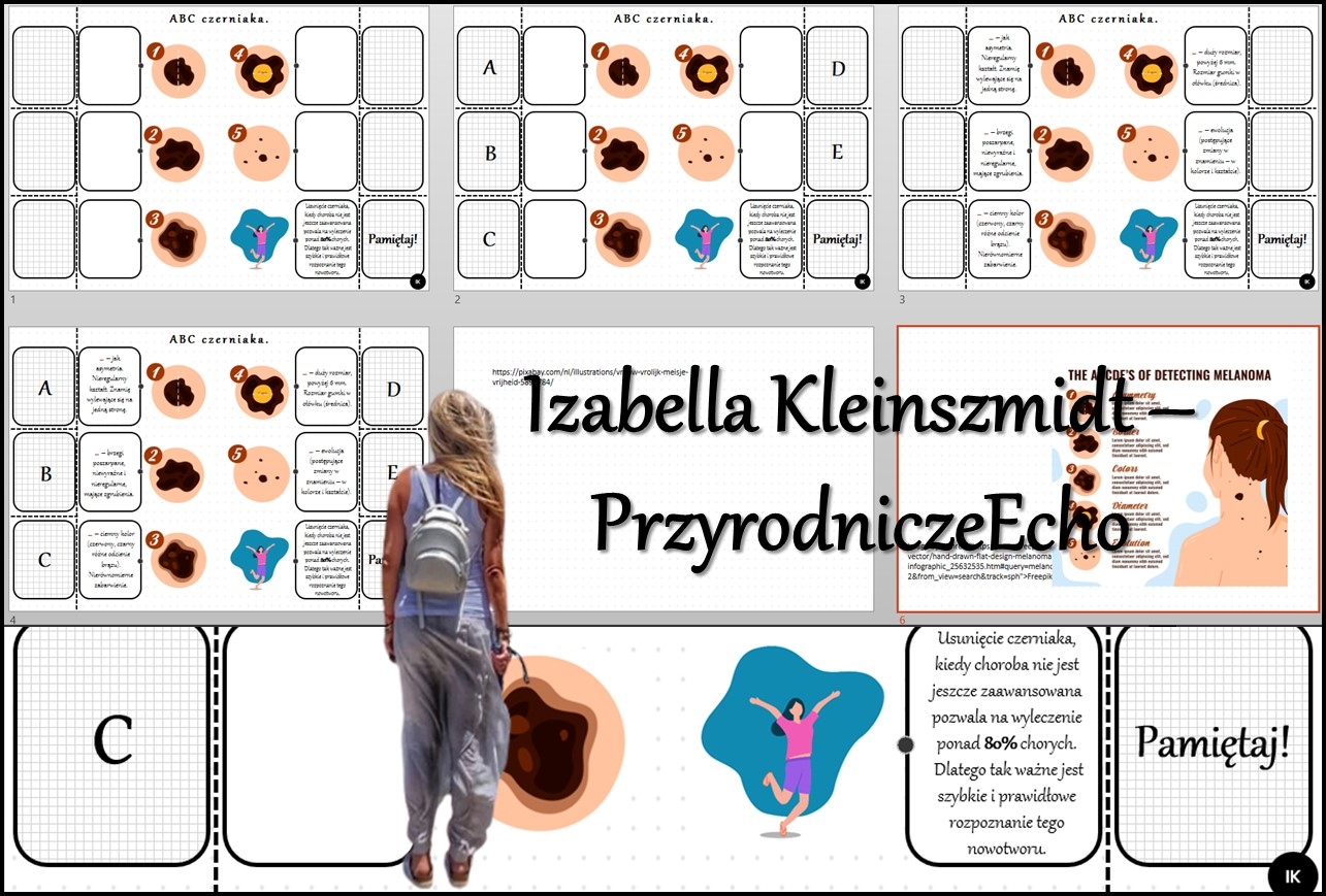 Notatka okienkowa/stacja zadaniowe/notatka/notatka graficzna/karta pracy/sketchnotka „ABC czerniaka”, „Higiena i choroby skóry" w pdf. Biologia 7 dział „Organizm człowieka. Skóra - powłoka organizmu”. Materiał wykonany na podstawie podręcznika z wydawnic