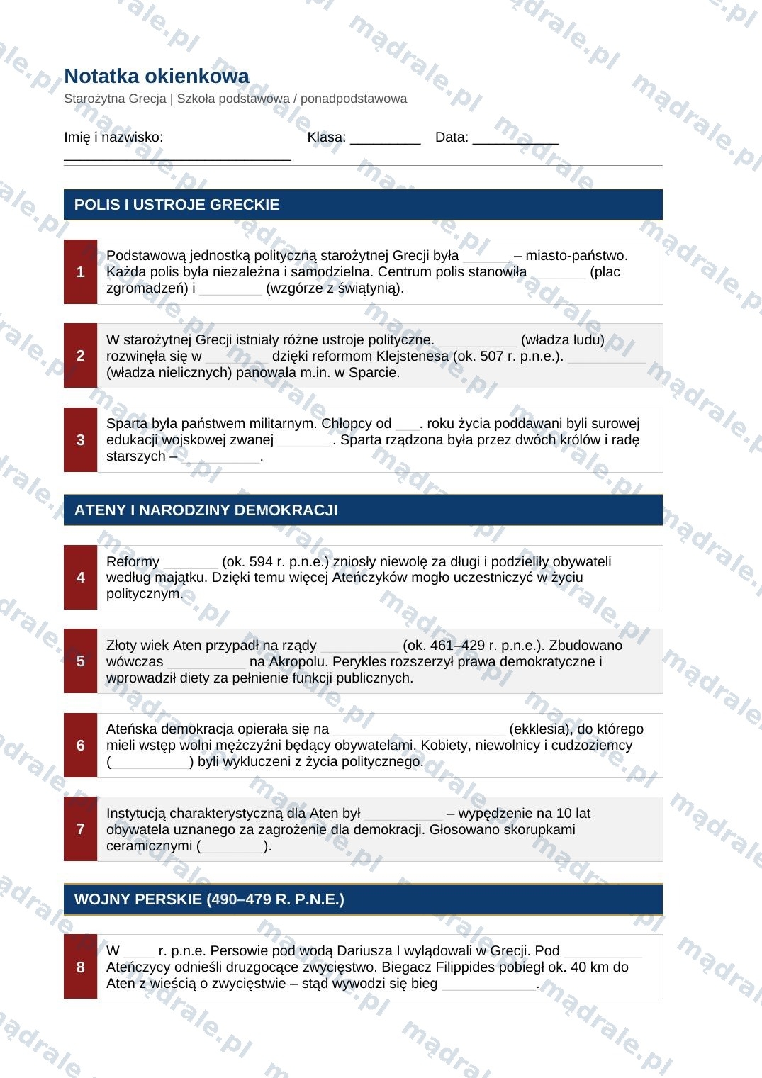 🧩 Notatkę okienkową dotyczącą starożytnej Grecji (m.in. polis, demokracja, religia, kultura).