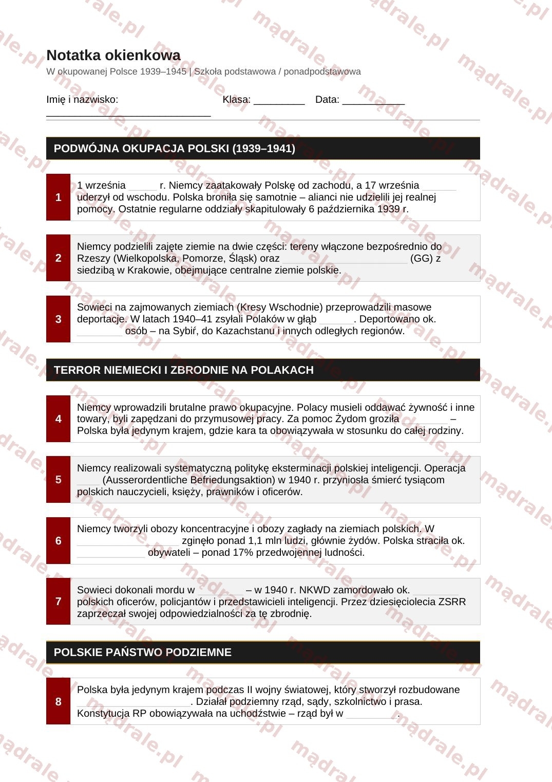 🧩 Notatkę okienkową dotyczącą życia w okupowanej Polsce podczas II wojny światowej (m.in. okupacja niemiecka i sowiecka, życie codzienne, ruch oporu).