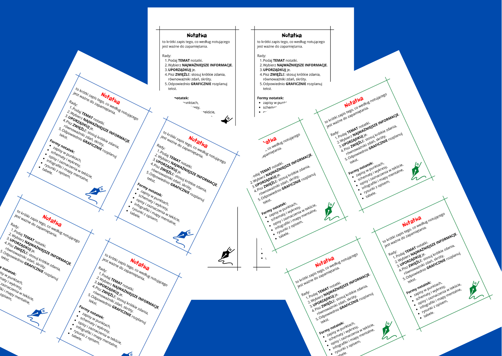 Zestaw zawiera wklejkę do zeszytu dotyczącą zasad pisania notatek (wersja czarno-biała i dwie wersje kolorowe).