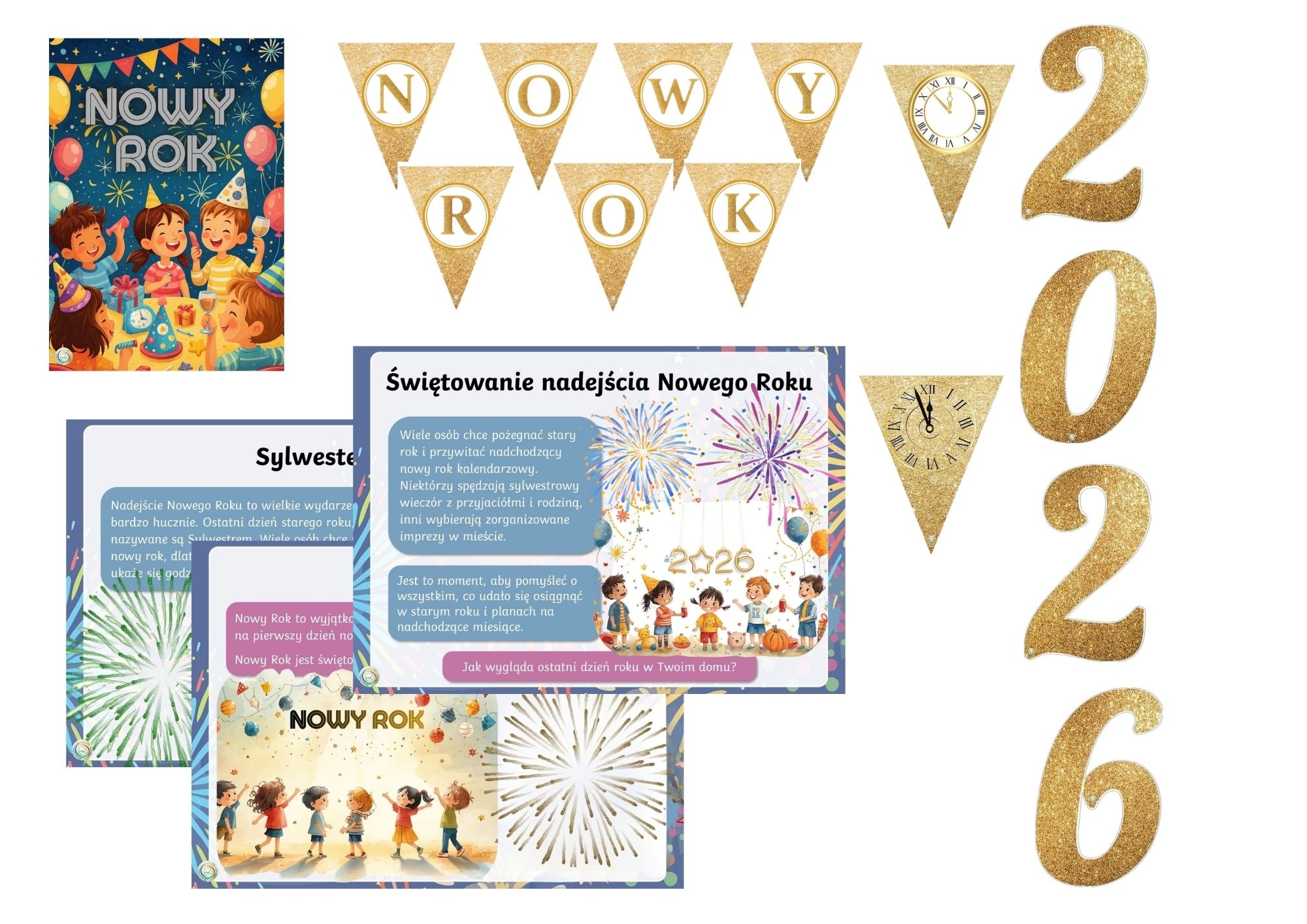 Oferuję kompletny zestaw materiałów noworocznych, który w atrakcyjny i kreatywny sposób wprowadzi dzieci w temat Nowego Roku 2026. Zestaw został przygotowany z myślą o nauczycielach przedszkola oraz edukacji wczesnoszkolnej.