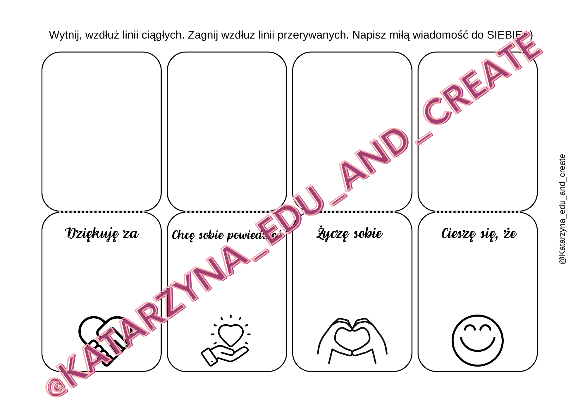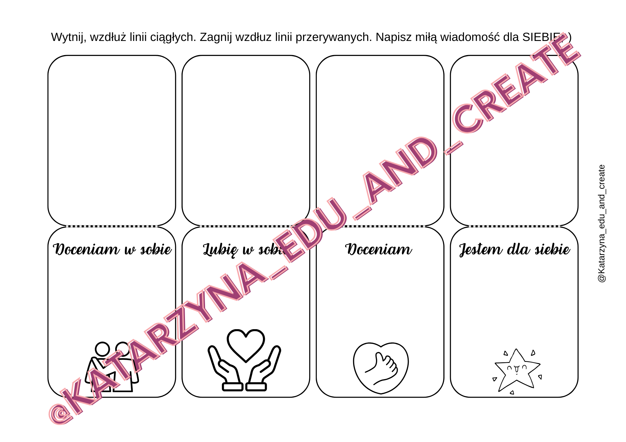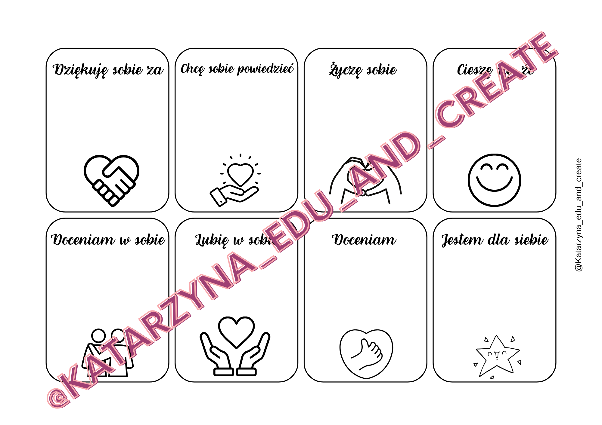 Czarno białe karteczki do wykorzystania przy tworzeniu kartek z uczniami i uczennicami, dekoracji na gazetkę szkolną. Można je wykorzystać do stworzenia wspólnej tablicy pełnej pozytywnych słów o sobie.