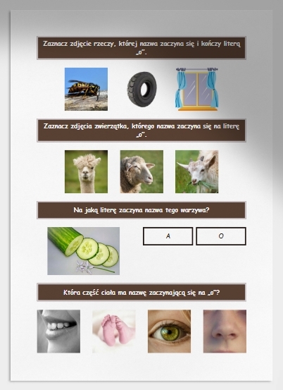 zadania obrazkowe, w których dzieci wskazują, co zaczyna się lub kończy na literę „o” 🖼️