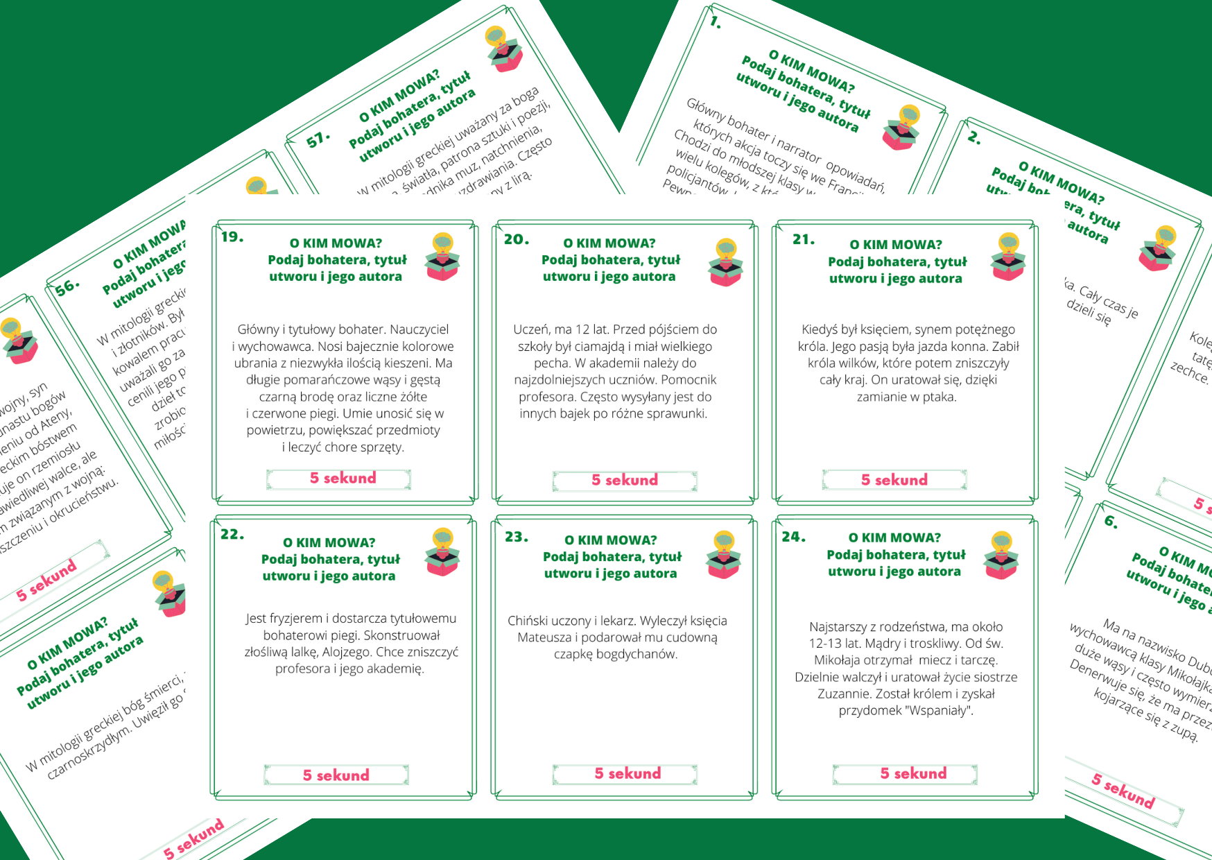 Zestaw 12 kart z 72 karteczkami do gry „5 sekund”, zawierającymi krótkie opisy bohaterów lektur obowiązkowych w kl. 4-6: "Mikołajek", "Akademia pana Kleksa", "Kajko i kokosz. Szkoła latania", "Opowieści z Narnii. Lew, Czarownica i stara szafa", "Chłopcy z Placu Broni, "Katarynka", "W pustyni i w puszczy", "Hobbit, czyli tam i z powrotem", mity greckie.