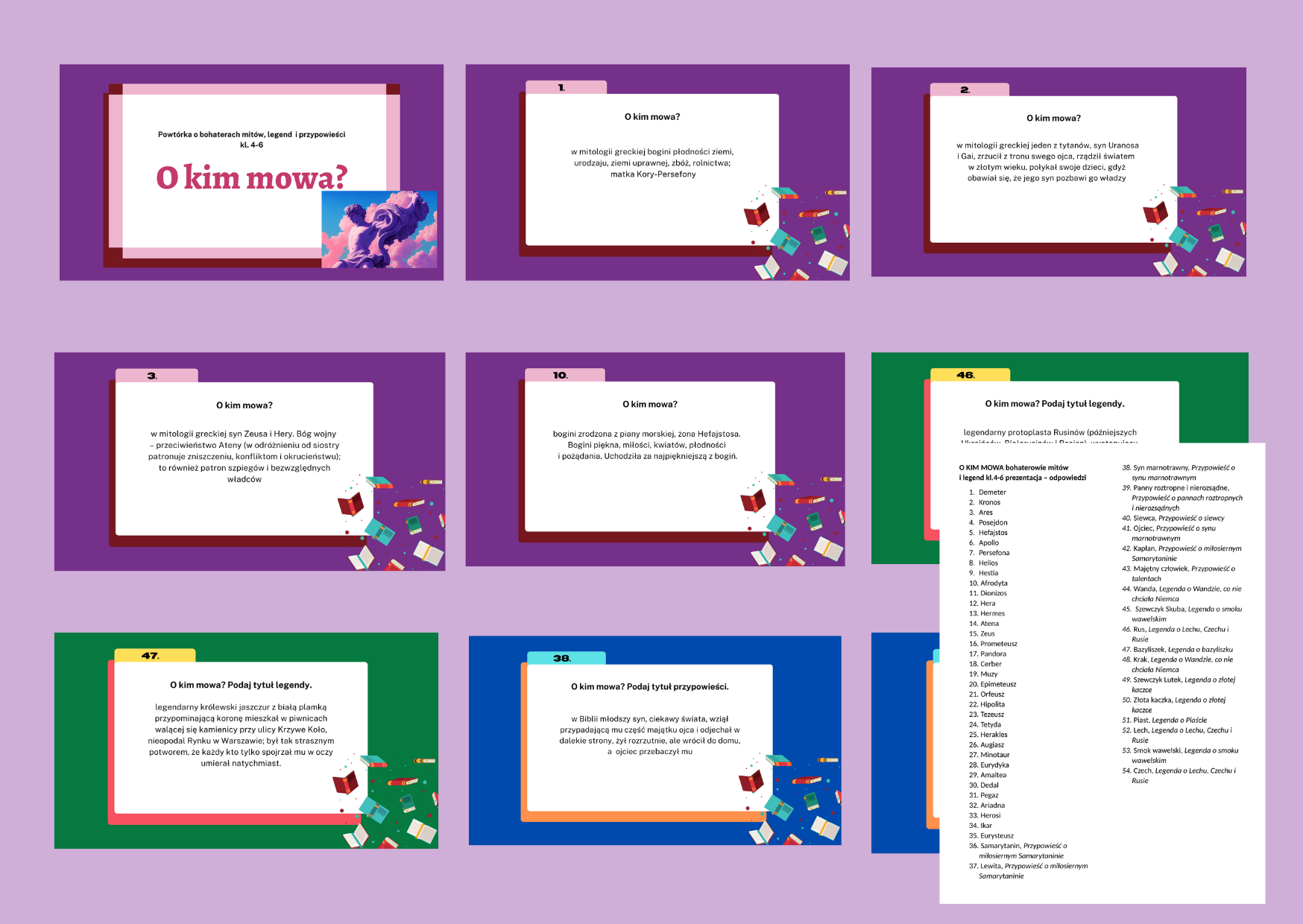 Prezentacja składająca się z 56 slajdów, na których znajdują się krótkie opisy 54 bohaterów mitów, legend i przypowieści omawianych w kl. 4-6. Uczniowie po zapoznaniu się z opisem muszą wskazać bohatera i tytuł tekstu. Prezentację można z powodzeniem wykorzystać na lekcjach powtórzeniowych. Do prezentacji dodałam odpowiedzi.