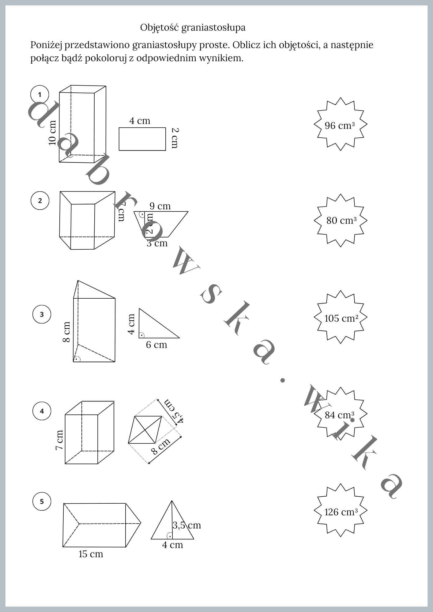 Zadaniem ucznia jest obliczenie objętości przedstawionych brył i połączenie ich bądź pokolorowanie z odpowiednimi wynikami.