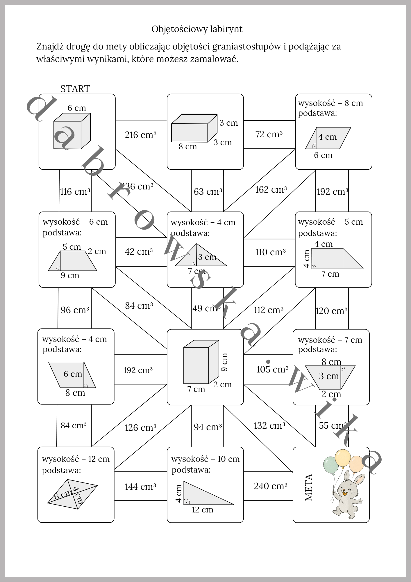 Materiał zawiera kartę pracy w formie labiryntu, w której uczniowie obliczają objętości graniastosłupów prostych.