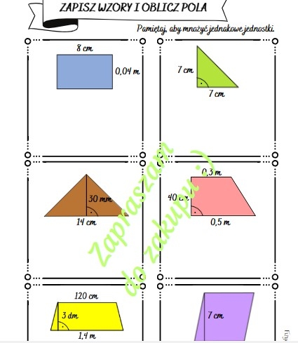 Uczeń zapisuje pola poszczególnych wielokątów oraz oblicza ich pola na podstawie podanych wymiarów. Utrudnieniem są różne jednostki, które należy ujednolicić.