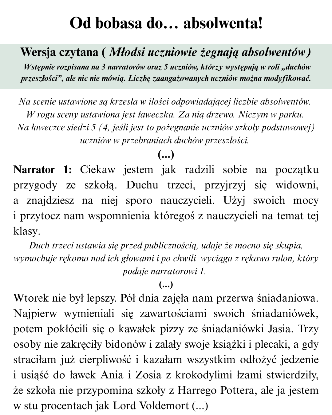 ¾ wersja czytana z narratorami – idealna dla klas które wolą lżejszą inscenizację bez nauki długich ról,
