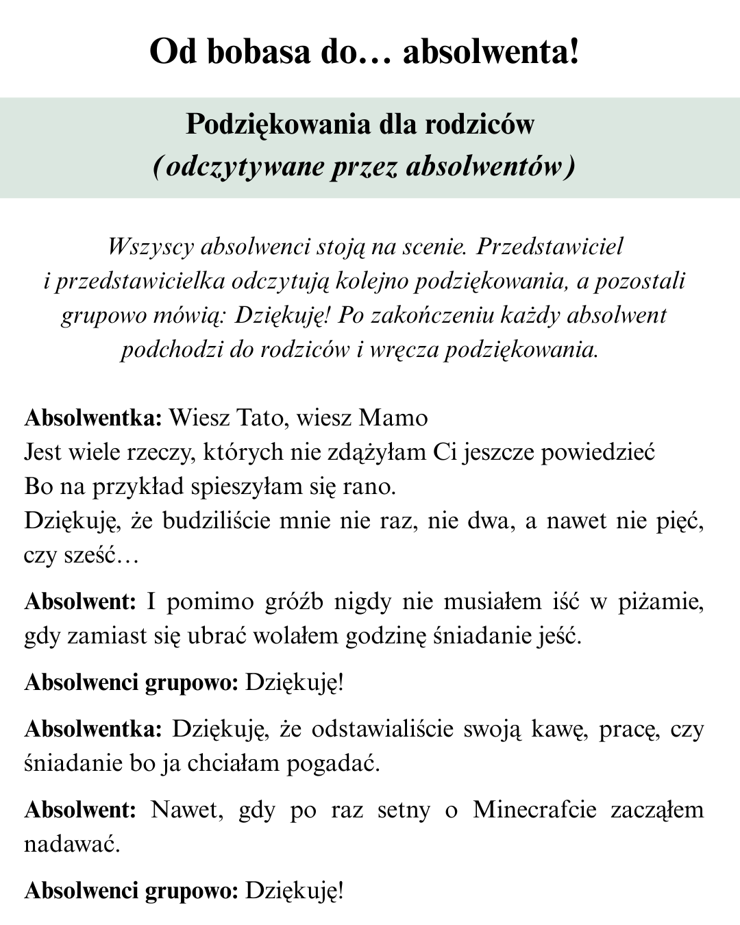 2. Gotowe podziękowania do odegrania podczas uroczystości: