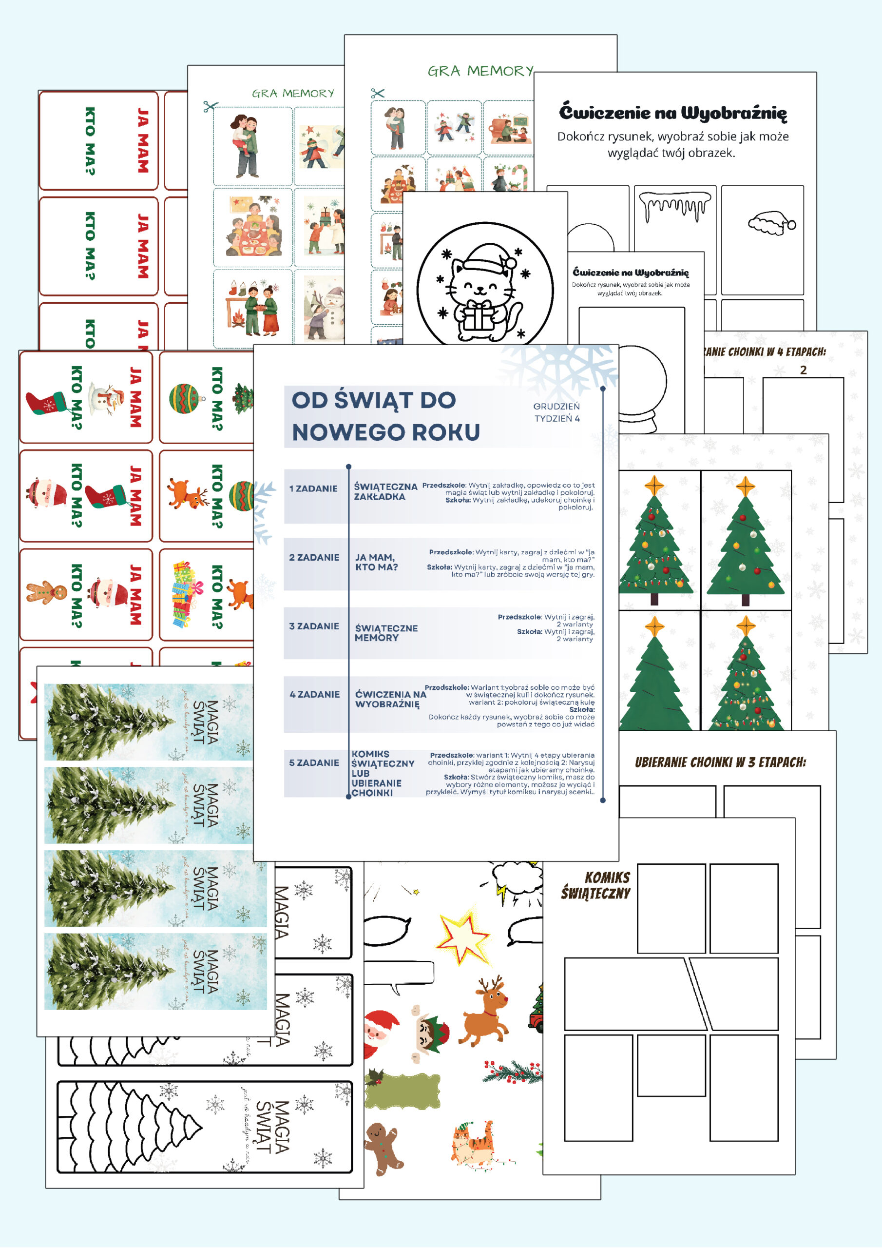 4 tydzień z pakietu zimowo-świątecznych kart pracy, zabaw i pomysłów na zajęcia dla przedszkola oraz klas 1–3 szkoły podstawowej. Każdy dzień ma przygotowaną osobną wersję dla przedszkola i dla edukacji wczesnoszkolnej.