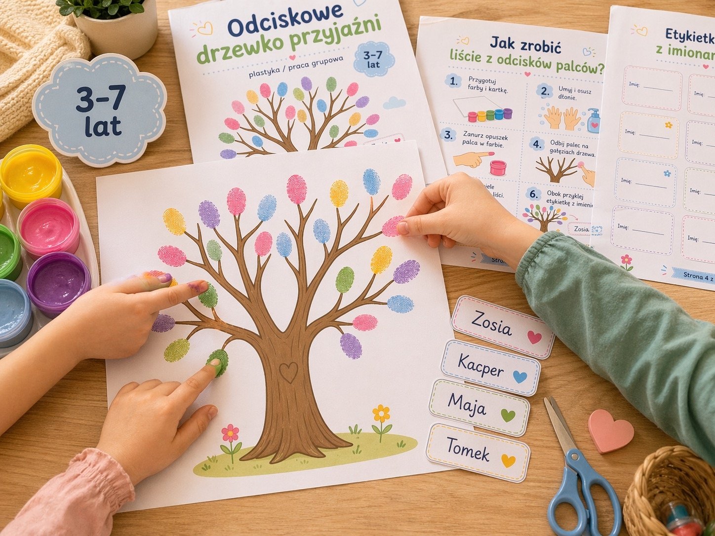„Odciskowe drzewko przyjaźni” to urocza i angażująca praca plastyczna dla dzieci w wieku 3–7 lat, która świetnie sprawdzi się w przedszkolu, zerówce i młodszych klasach 🌳🖐️