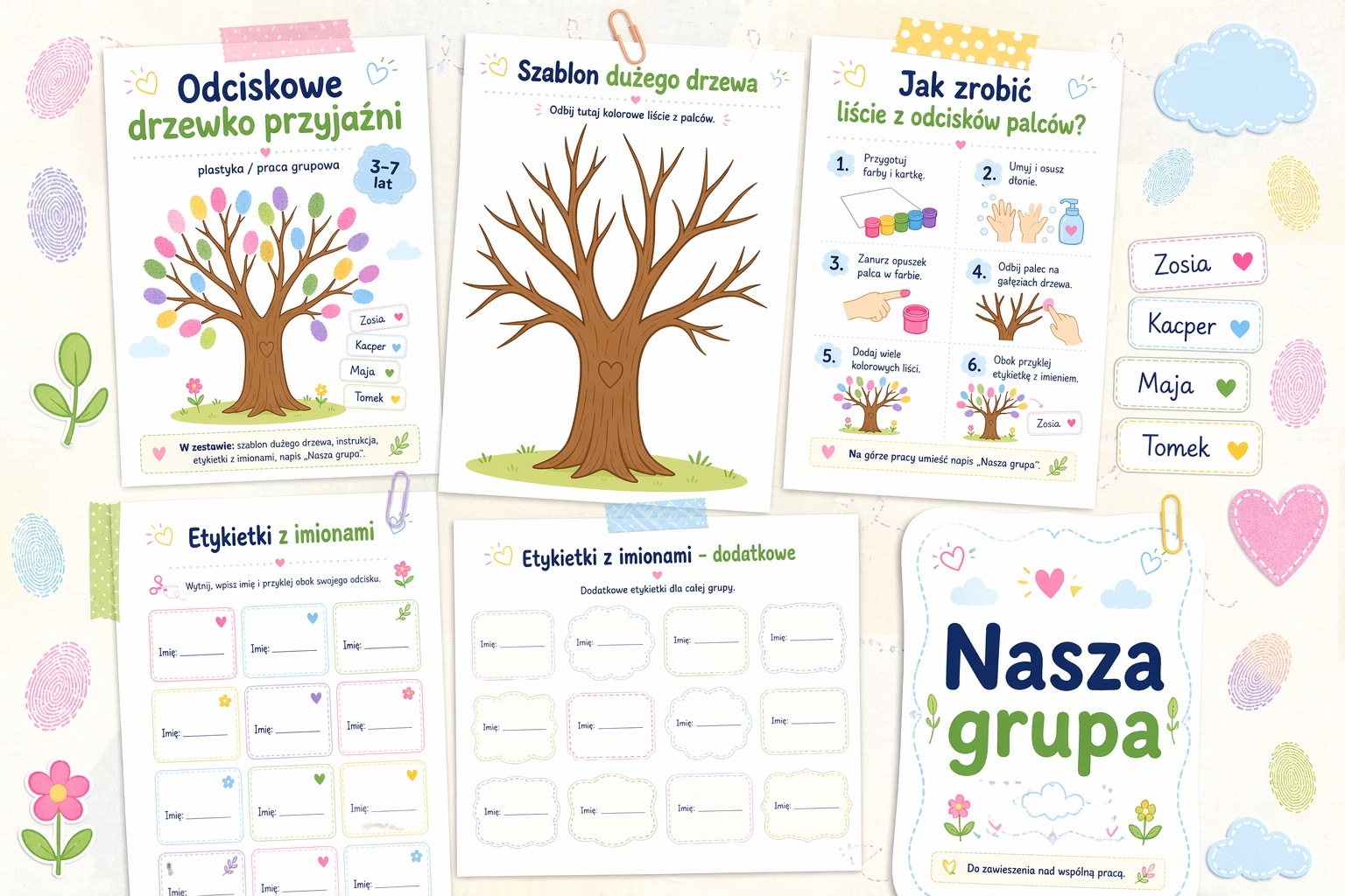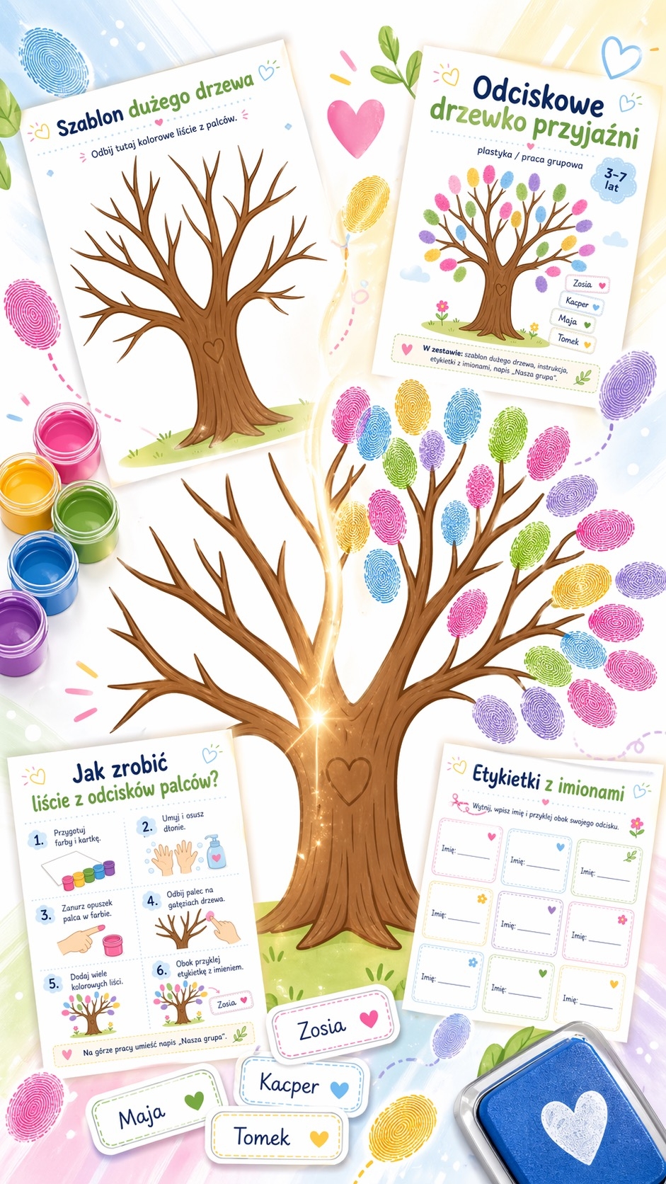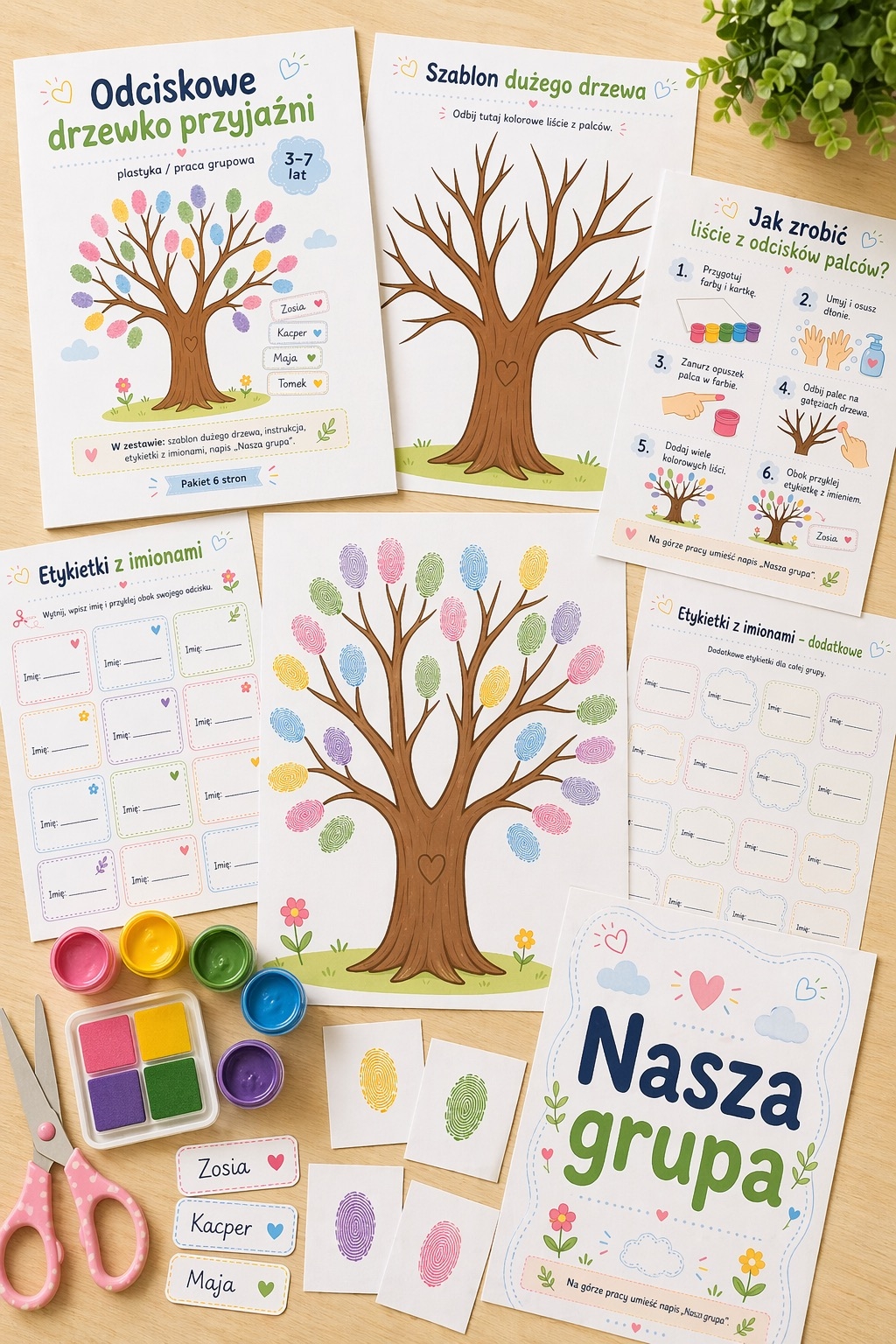 W zestawie znajduje się duży szablon drzewa, instrukcja wykonania, etykietki z imionami oraz napis „Nasza grupa”, dzięki czemu całość jest gotowa do wykorzystania od razu po wydruku ✂️🎨