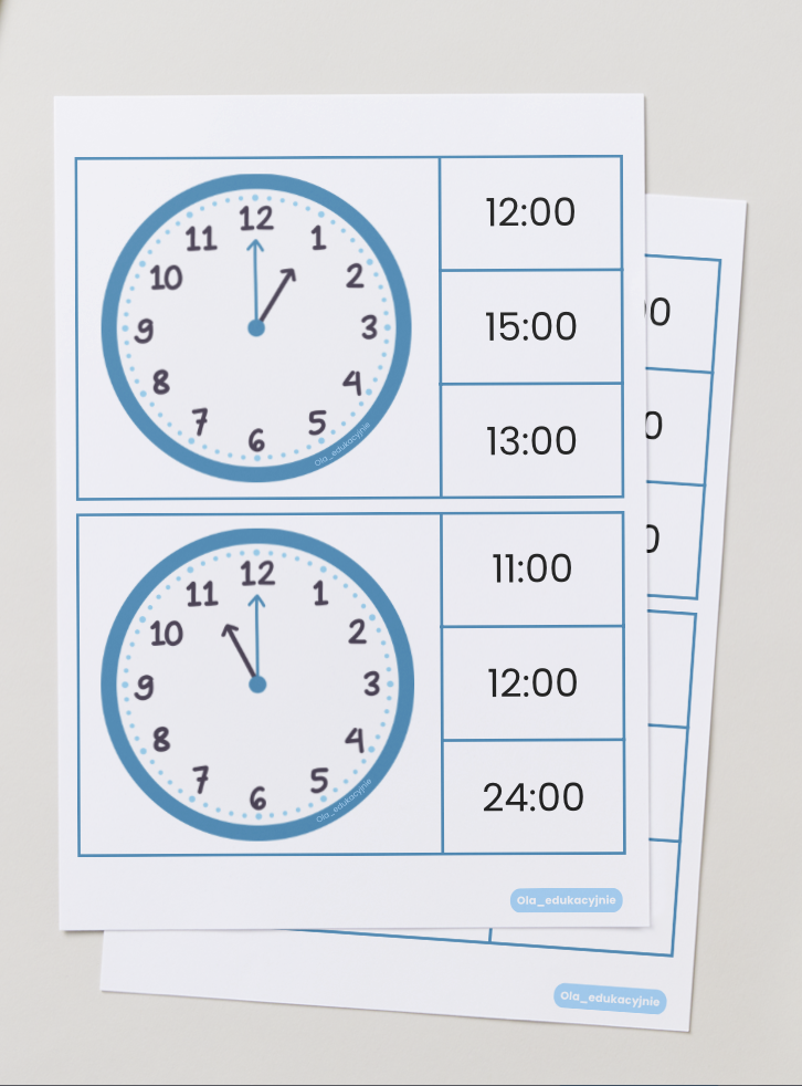 Na kartach znajdują się zegary przedstawiające wyłącznie pełne godziny, dzięki czemu uczniowie mogą skupić się na podstawowej umiejętności rozpoznawania położenia wskazówki godzinowej bez dodatkowego obciążenia informacyjnego.